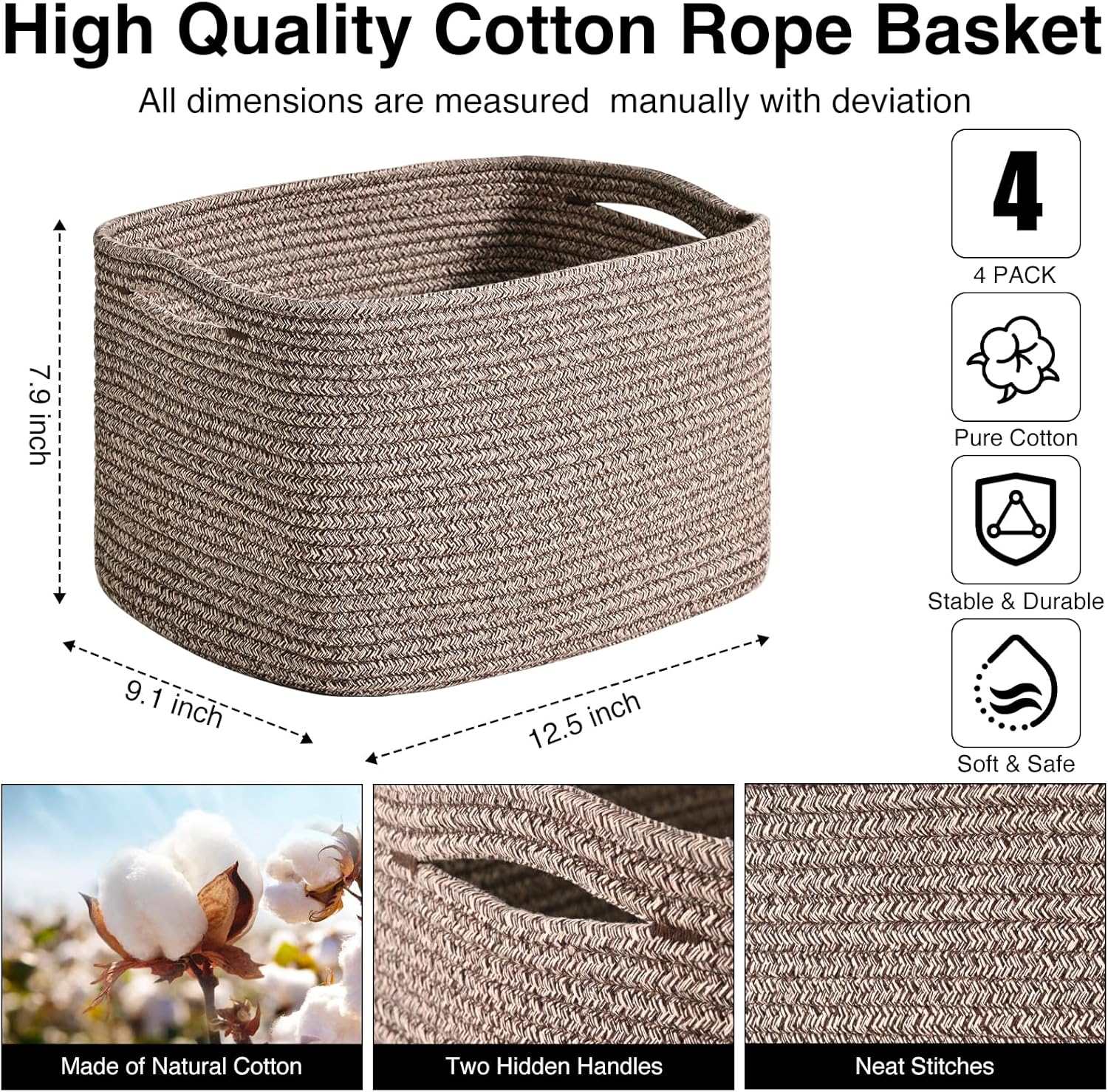 - Decorative Storage Baskets: The Size of gray basket is 12.5"x9.1"x7.9". Our stylish and practical small woven baskets are a great way to display items on tables and counters. They come in neutral colours and a sleek, sophisticated shape. These organizing baskets are all made of natural cotton rope and safe for kids and pets