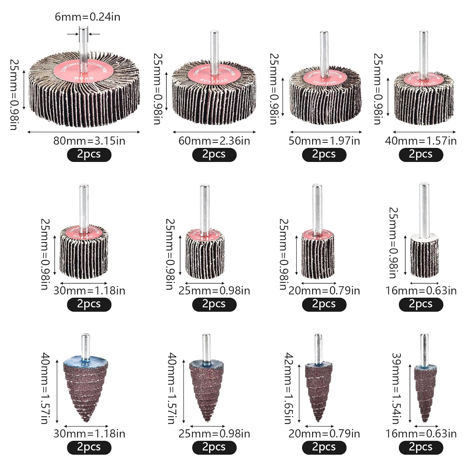 - 【Specification】Provide two series of cylindrical and conical sanding heads with 80 grit. The package has 12 different specifications of sanding paper polishing wheels, and each specification contains 2 pieces, a total of 24 pieces set. Diversified shapes and sizes are designed to ensure a precise fit to the surface contours of various items, so whether it's cutting, grinding or polishing work, it can be easy to meet your individual needs.