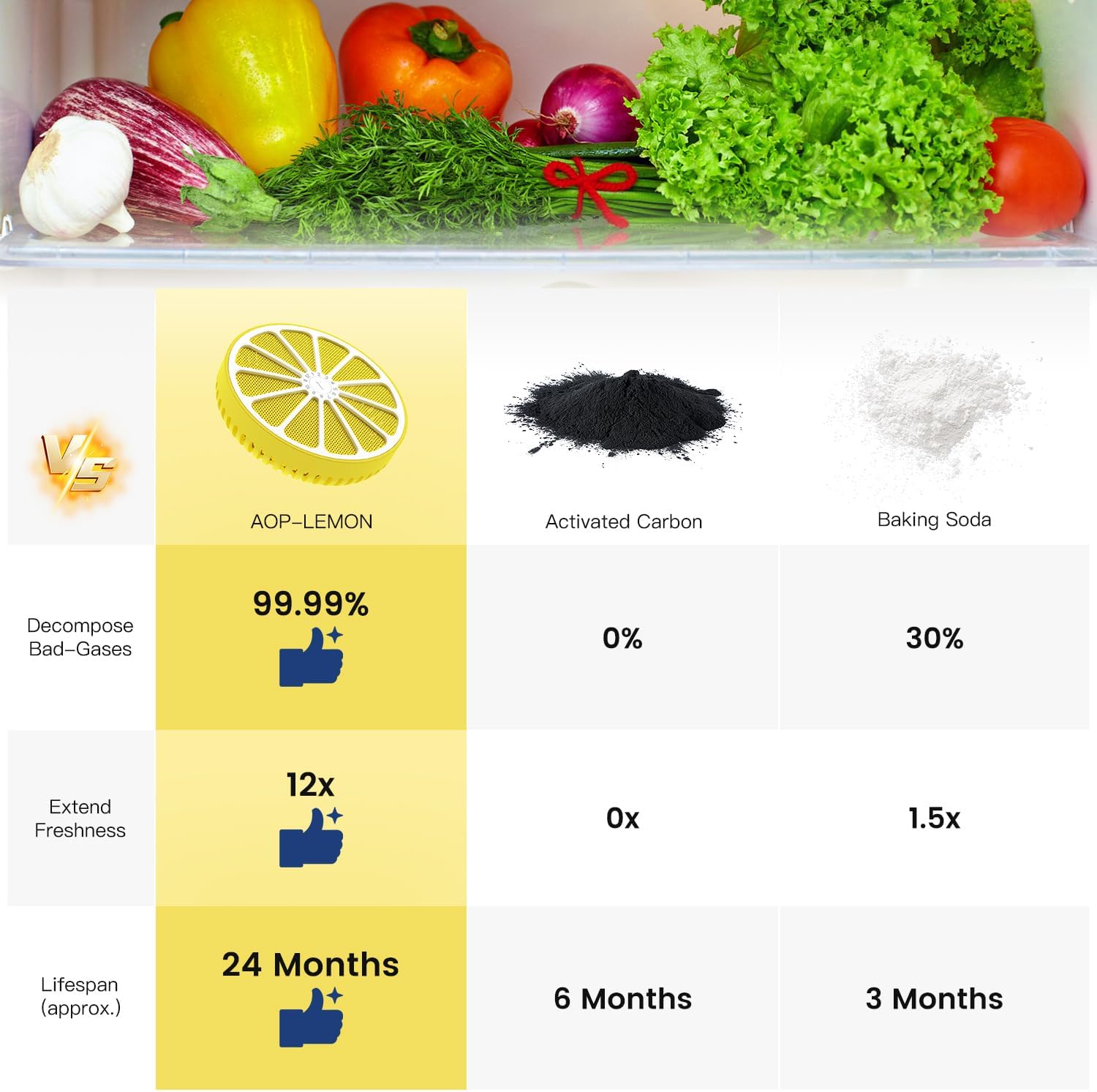 - Advanced Refrigerator Deodorizer – Destroy Fridge Odors Naturally: Lab-tested AOP-KF Solid Alkali Technology absorbs and neutralizes stubborn kitchen odors (fish, spoiled milk, garlic) – no masking, zero residue.