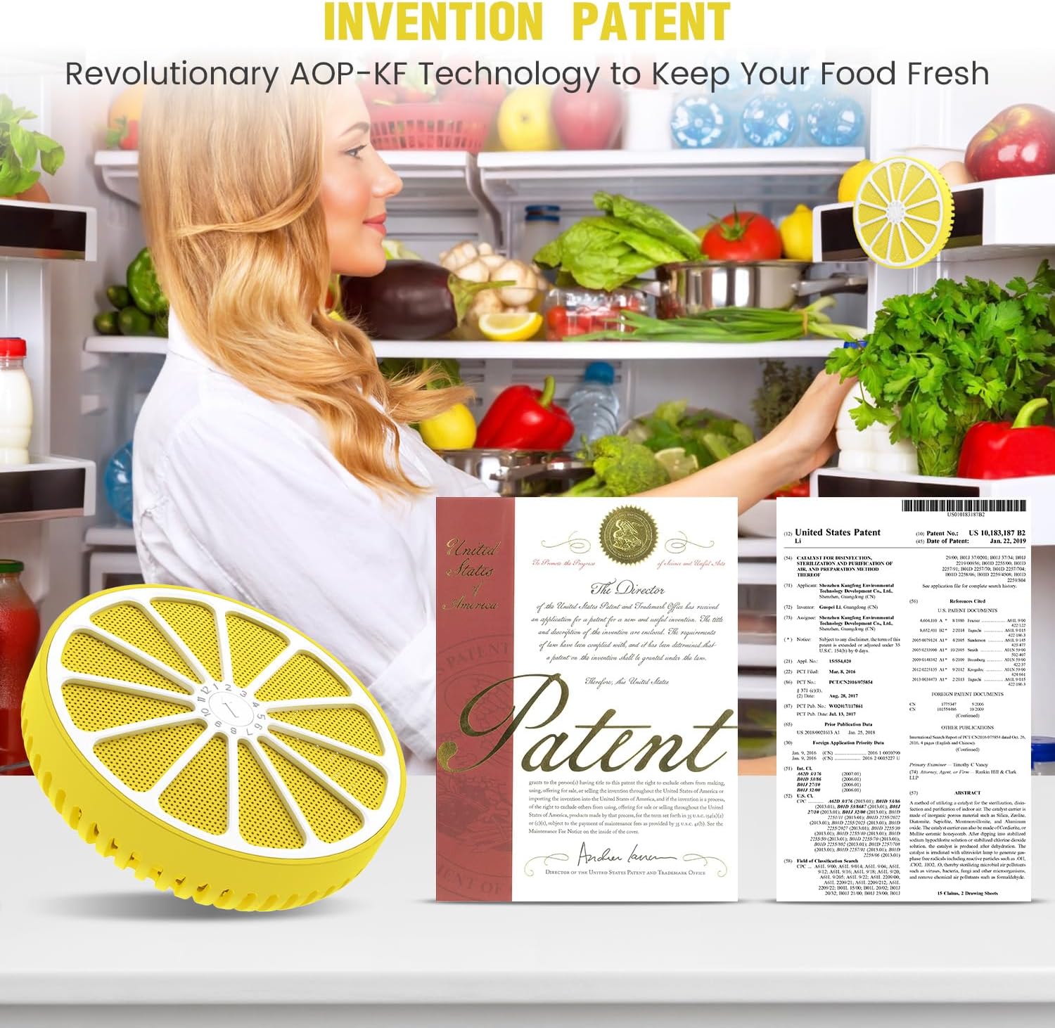 Refrigerator Deodorizer with AOP-KF Solid Alkali Technology, 2 Years Long-Lasting Fresh Odor Eliminator for Fridge, Kitchen, Apartment, Closet & Small Spaces, Lemon Design & Adjustable Clip (3 Packs)