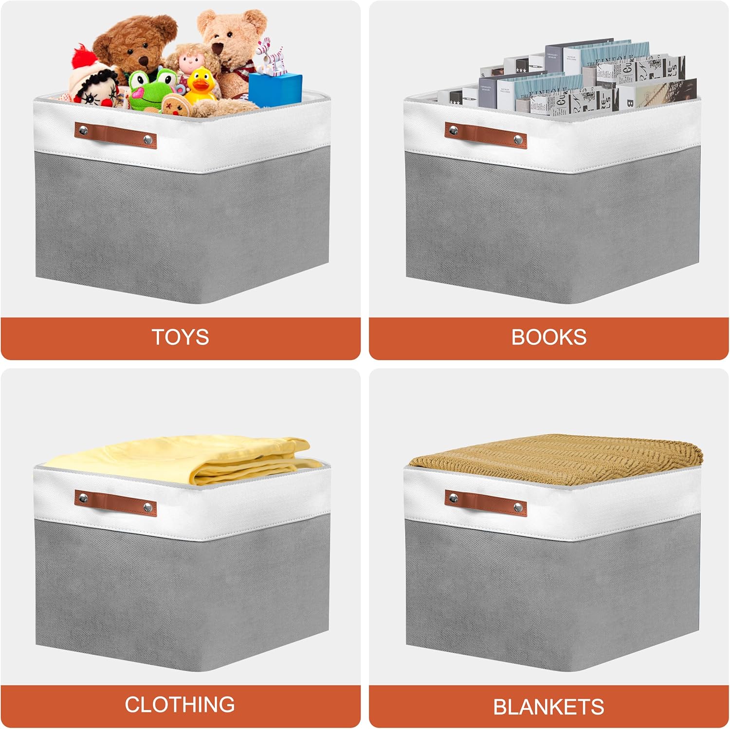 13in Open Fabric Storage Basket with Leather Handles for Organizing, Collapsible Linen Closet Bins for Shelves, Closets, Laundry, Decorative Basket for Gifts. (White&Gray, 3PCS/13x13in)