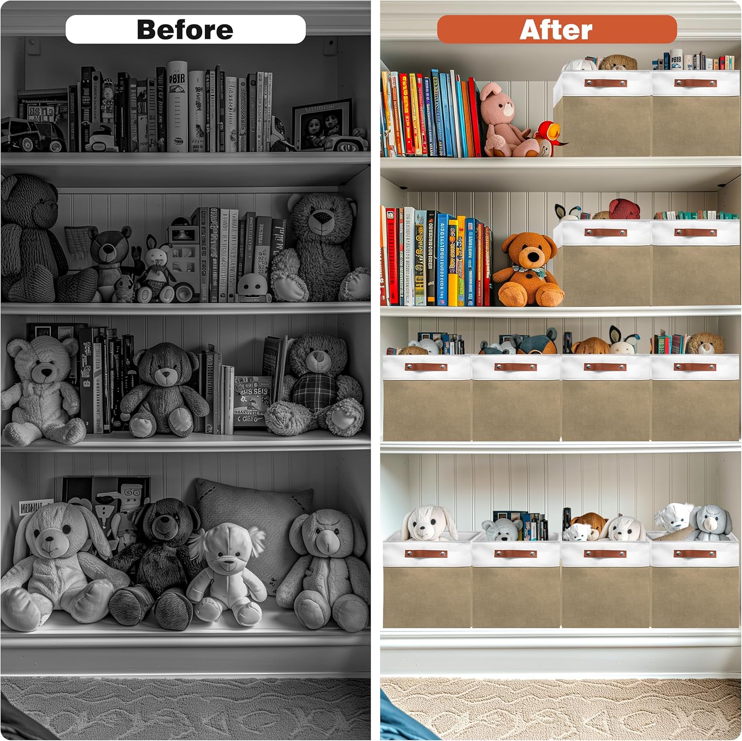 12in Open Fabric Storage Basket with Leather Handles for Organizing, Collapsible Linen Closet Bins for Shelves, Closets, Laundry, Decorative Basket for Gifts. (White&Khaki, 2PCS/12x12in)