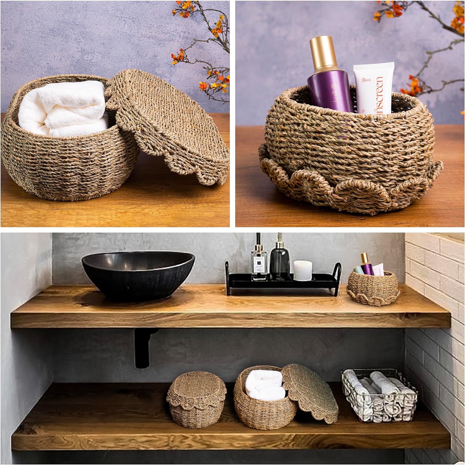 - Durable Material: Our set of 3 wicker storage baskets with lids is crafted from natural water hyacinth, ensuring durability and a charming rustic aesthetic. Featuring a scalloped edge design, these handwoven baskets are easy to open and close, keeping your belongings dust-free while seamlessly complementing your home décor.