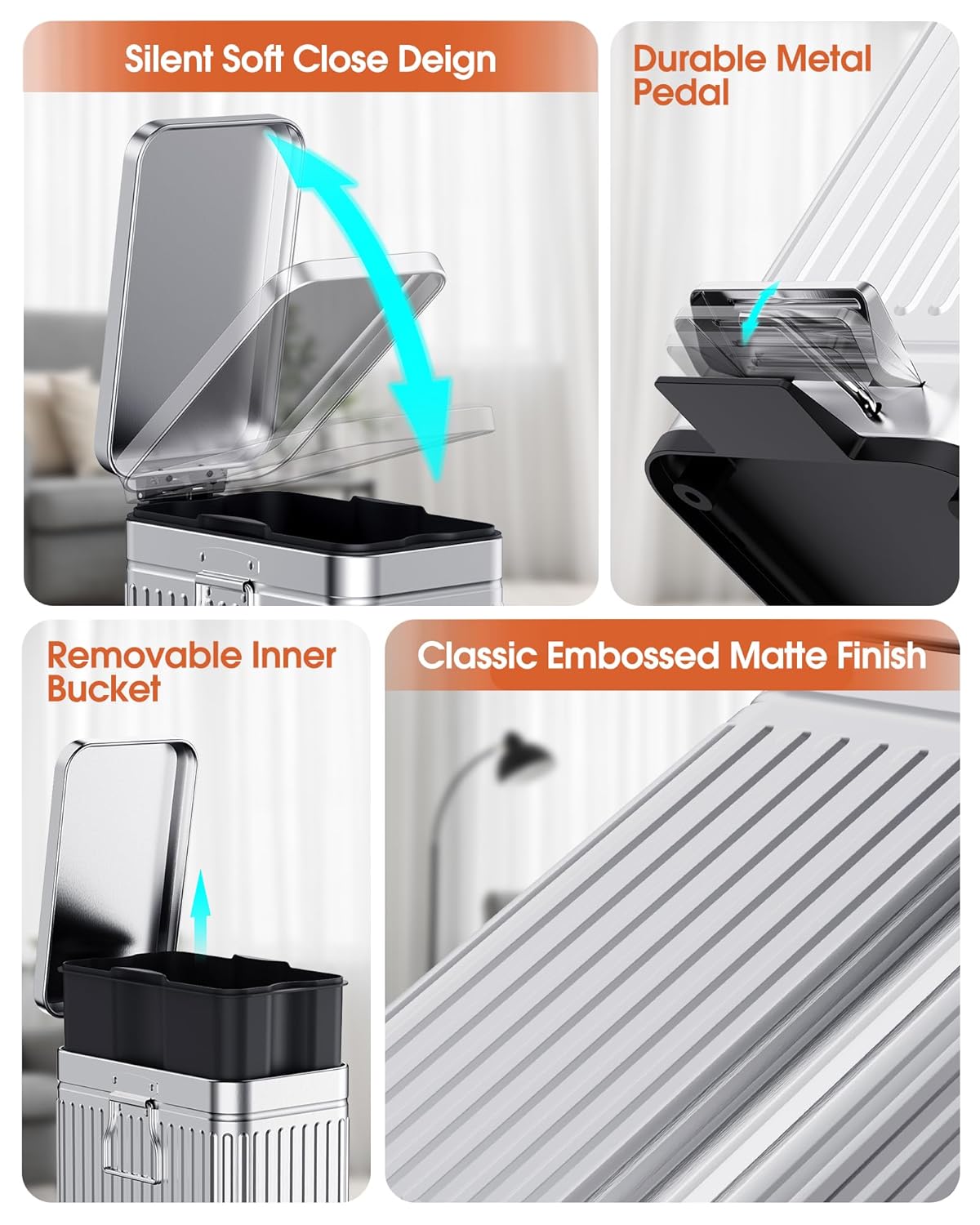 - High Quality: The trash cans are made from stainless steel, rust and fingerprint-proof; The matte embossed finish results in a stylish and modern design for bathroom, bedroom, office, toilet, dorm