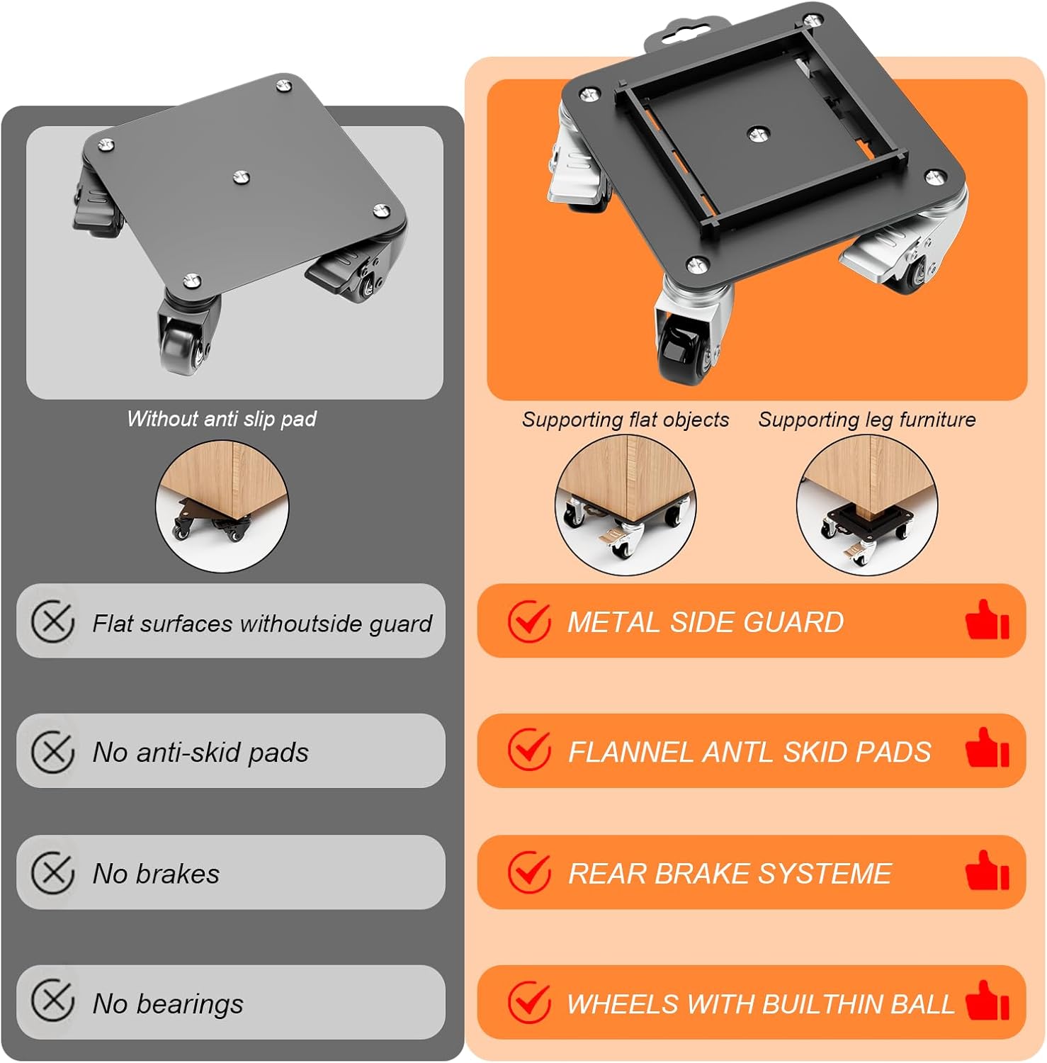 - Removable Side Guard Design: This upgraded heavy-duty furniture dolly features secure metal side guards that stabilize items with legs, preventing tipping during transport. Perfect for safely moving tables, chairs, and other furniture, this design ensures controlled, secure transportation.