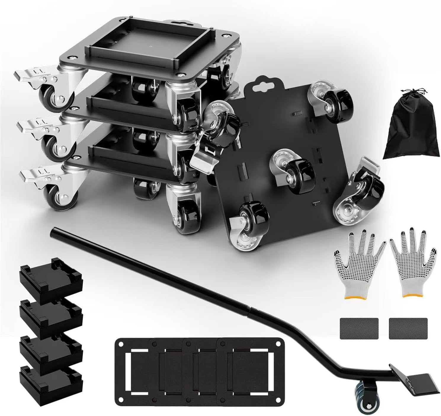 - Complete Furniture Lifter Tool: This set includes four 6.33"x6.33" dollies, 4 anti-skid pads, 16 removable side guards, 1 elastic cord, 1 crowbar, 2 anti-skid crowbar pads, 4 height-raising blocks, 1 pair of gloves, and 1 canvas bag—everything you need for efficient and safe moving.