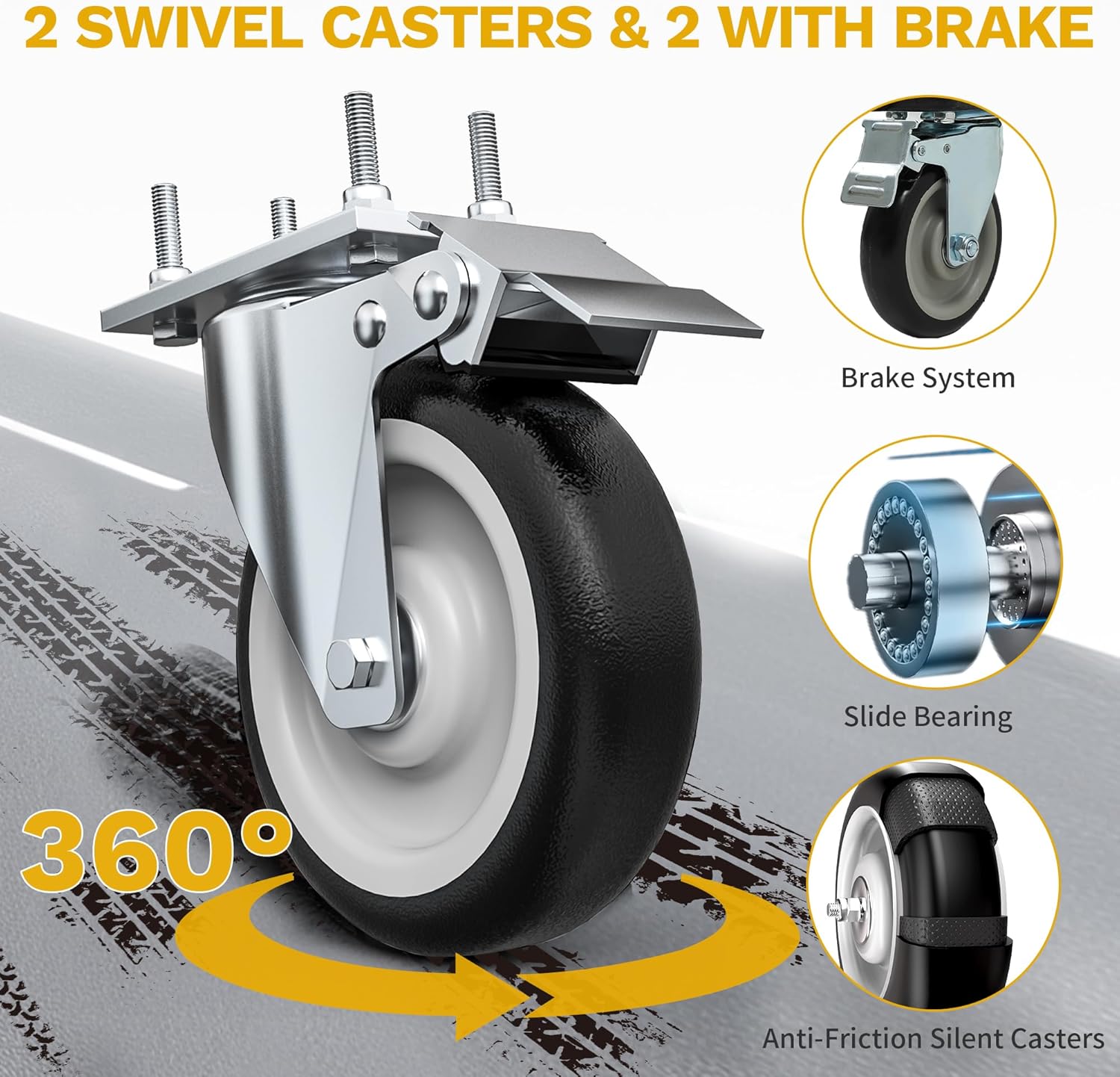- Efficient Locking Wheels and Smooth Movement: The utility cart is equipped with four 5-inch swivel casters made from industrial-strength polypropylene, ensuring smooth movement and long-lasting durability. Two of the casters are lockable, providing enhanced 360-degree maneuverability and reducing effort during transport. Additionally, the thermoplastic rubber wrap on the wheels absorbs vibration, reduces noise, and prevents floor damage and carpet snags