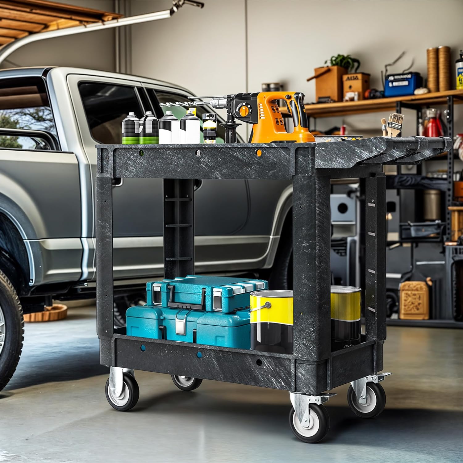 DWVO Utility Cart, 1000 lbs Capacity, 2 Shelf Heavy Duty Plastic Service Utility Cart on Wheels, Rolling Storage Work Carts Suitable for Warehouse, Garage, School & Office, Cleaning, Black