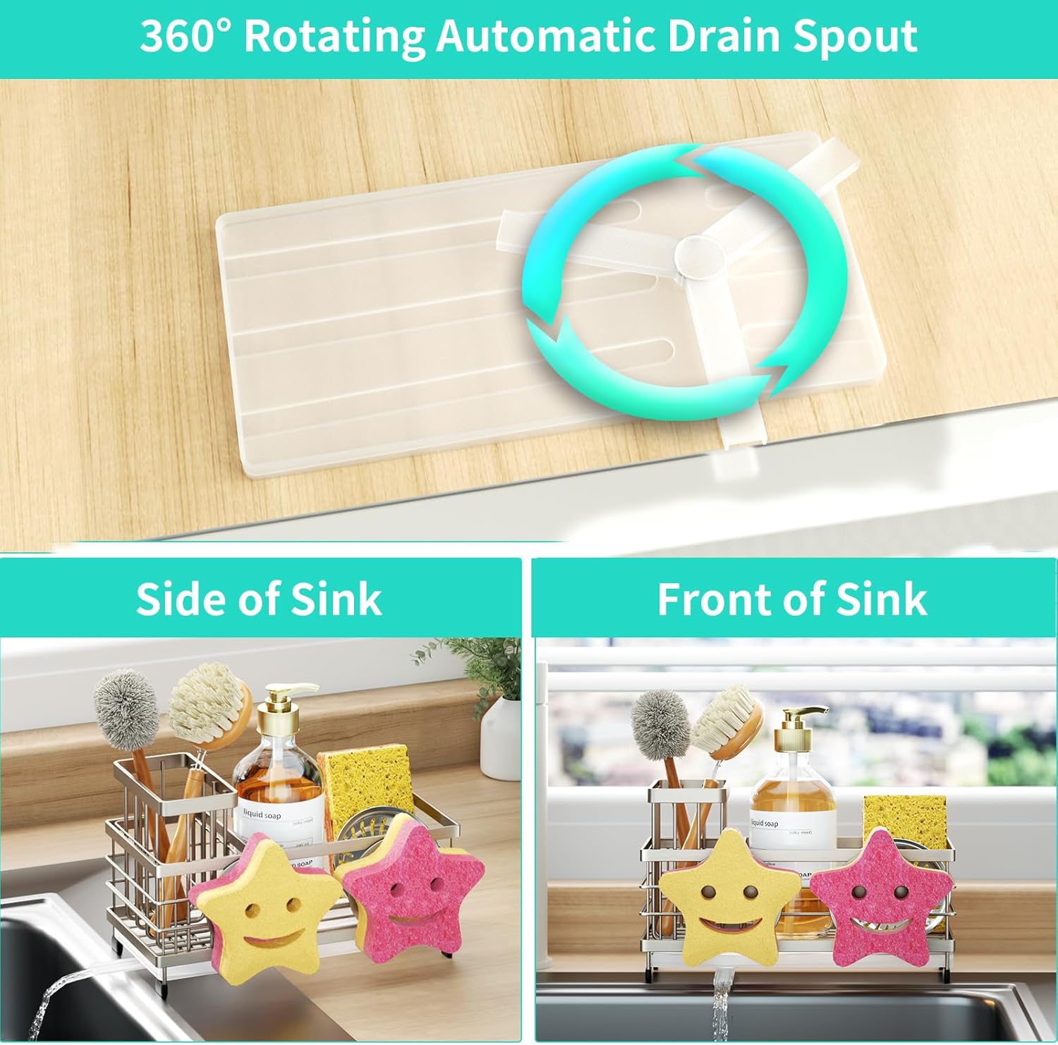 - [360° Rotating Drainage]: The 360° rotating drainage pipe on our sponge holder ensures your kitchen stays dry and clean, effortlessly directing water into the sink. The drain pipe is removable, so you can remove it for cleaning