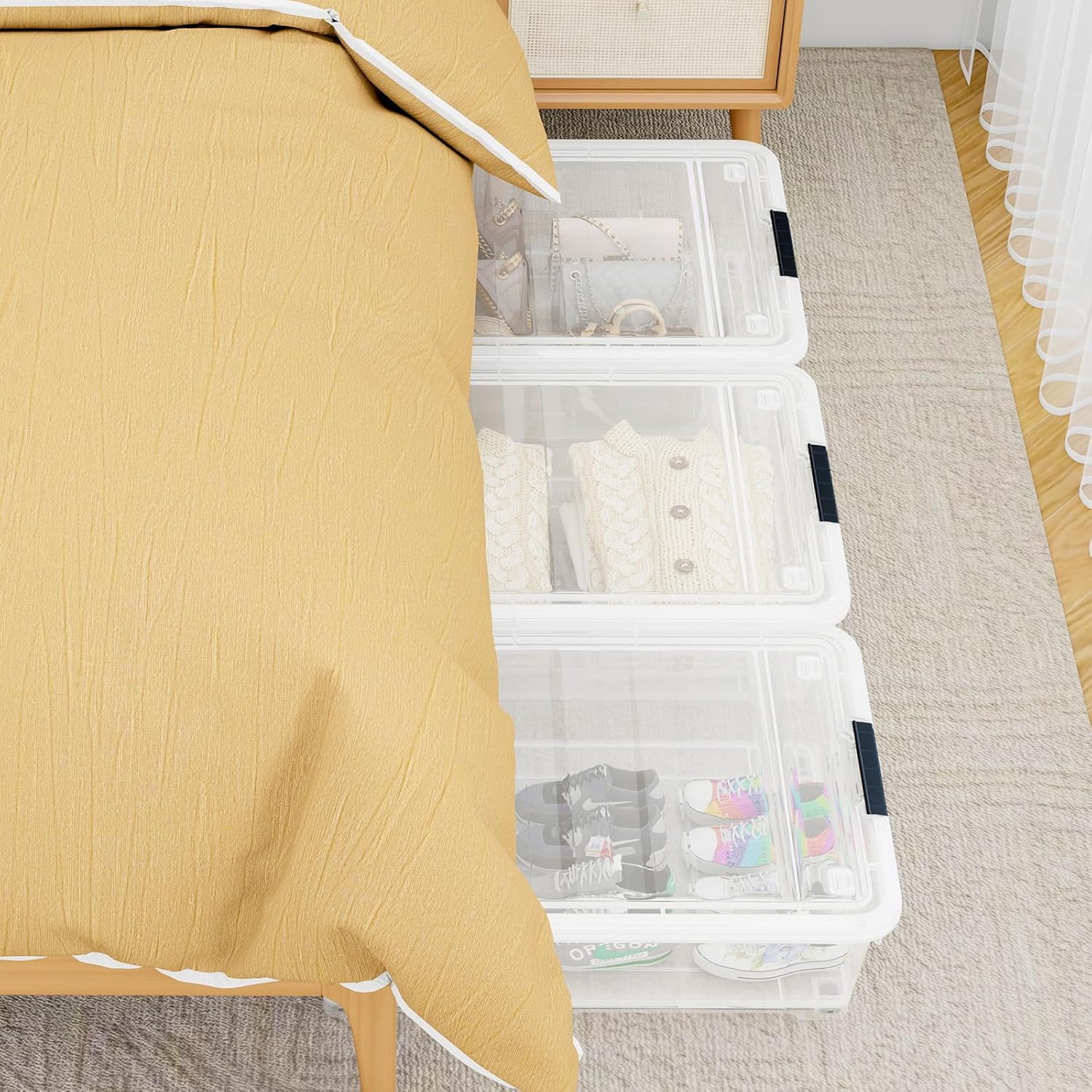 25 Quart Clear Plastic Latch Storage Box with Wheels, Under Bed Storage Box, 3 Pack