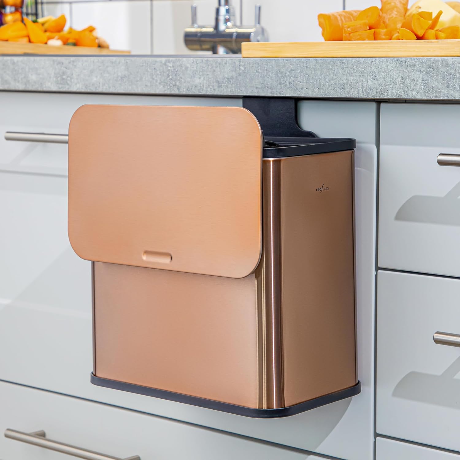 RedFactor Stainless Steel Hanging Trash Can with Lid and Inner Bucket – Slim 1.3 Gallon Odor-Free Compost Bin for Kitchen Cabinet, Countertop, Under Sink, or Bathroom (Copper)
