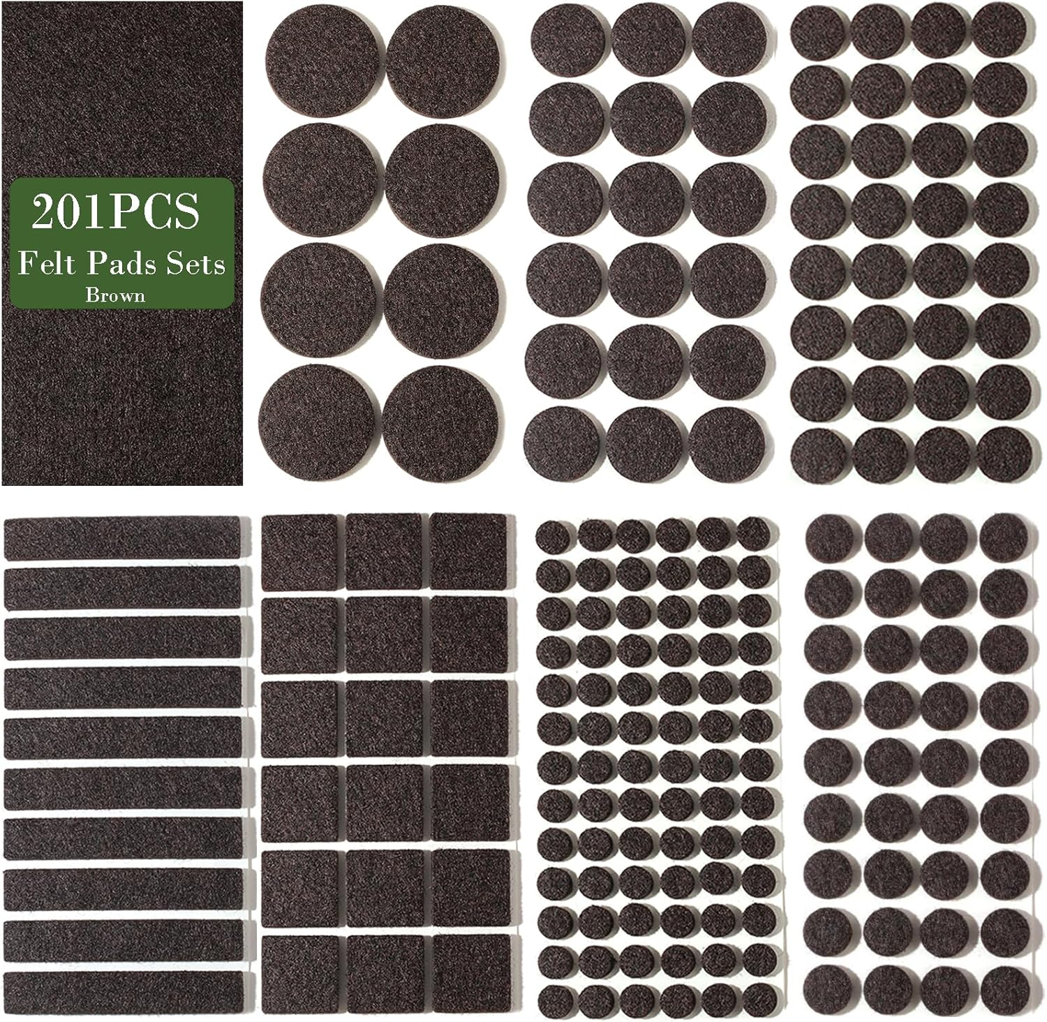 - 201 Pcs Brown Felt Furniture Pads Includes: Round Felt Pads: (8) 1.57" Heavy Duty Self Stick Felt Furniture Pads, (18) 1" Chair Leg Floor Protectors, (32) ¾" Felt Pads for Chair Legs, (78) 3/8" Small Felt Pads for Cabinet Doors Bumpers, (36) 5/8" Felt Furniture Pads, Strip Felt Pads: (10) 3"x1/2" Felt Strips with Adhesive Backing for Furniture, Square Felt Pads: (1) 6.6×3.3" Felt Pads for Chair, (18) 1×1" Self Adhesive Chair Square Felt Pad, All sizes can be trimmed for use on different furniture legs.