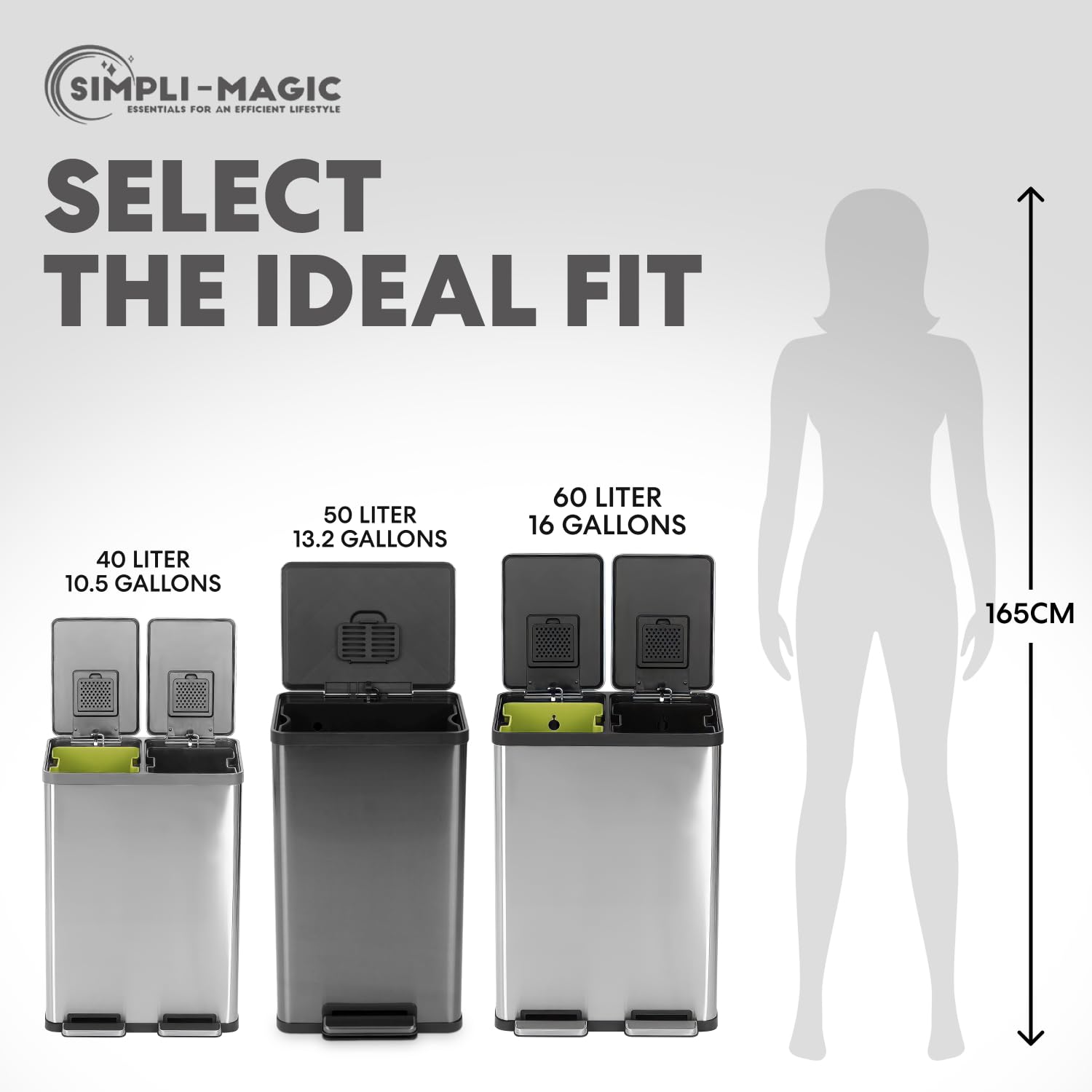 SIMPLI-MAGIC 13.2 Gallon (50L) Step Trash Can – Kitchen Garbage Can with Slow-Close Lid – Odor Control, Hands-Free, Easy to Clean, Brushed Stainless Steel