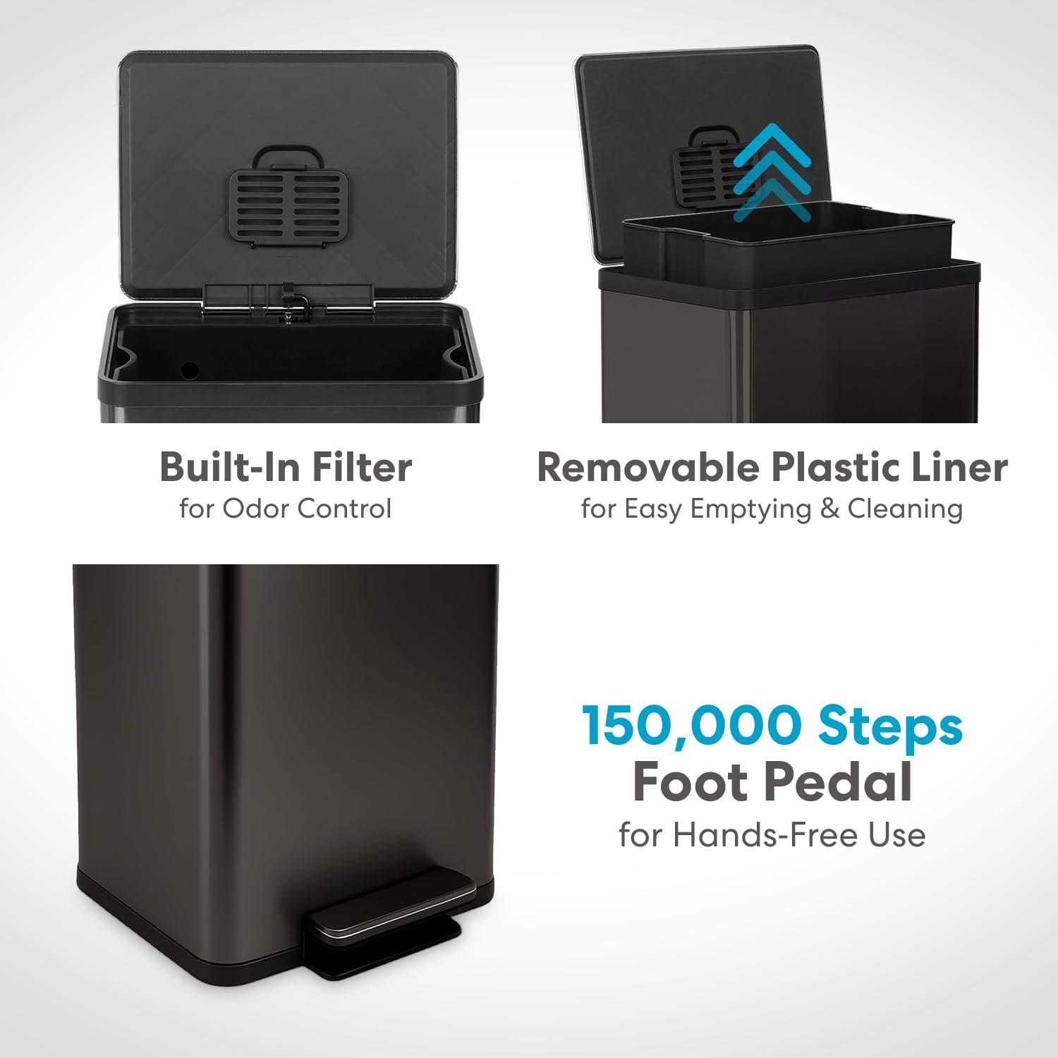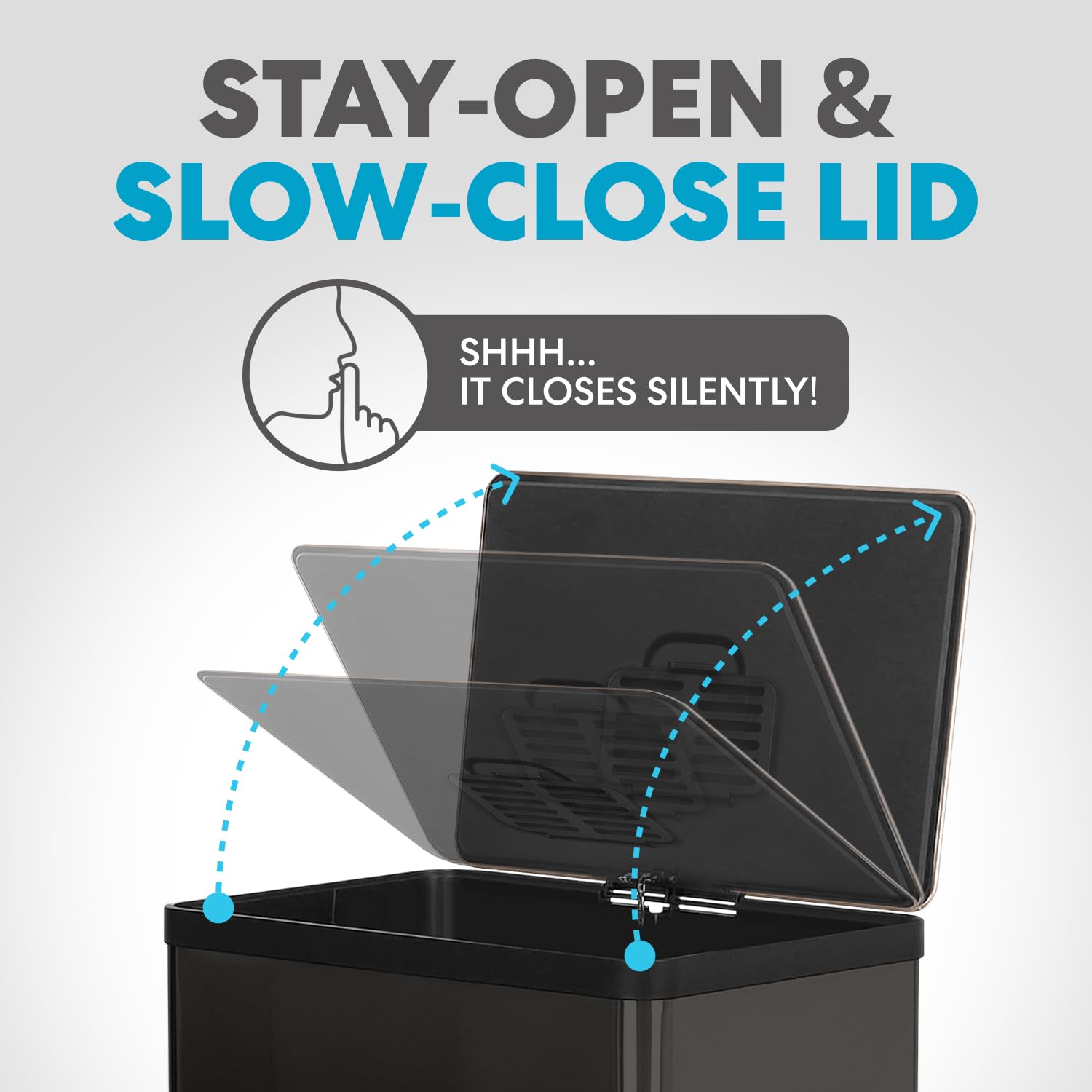 - Quiet-Close Lid: Lid closes quietly and gently without slamming. Hands Free and Fingerprint Proof: Hands-free operation with durable a metal foot pedal and fingerprint-resistant stainless steel finish leads to your trash can staying cleaner longer