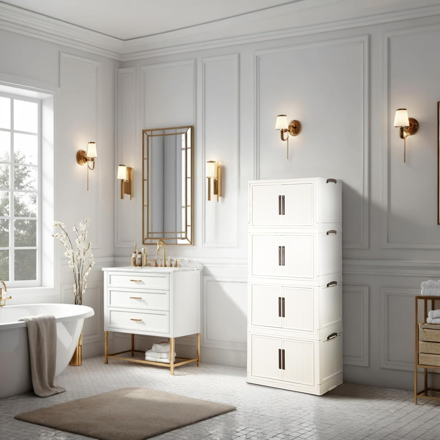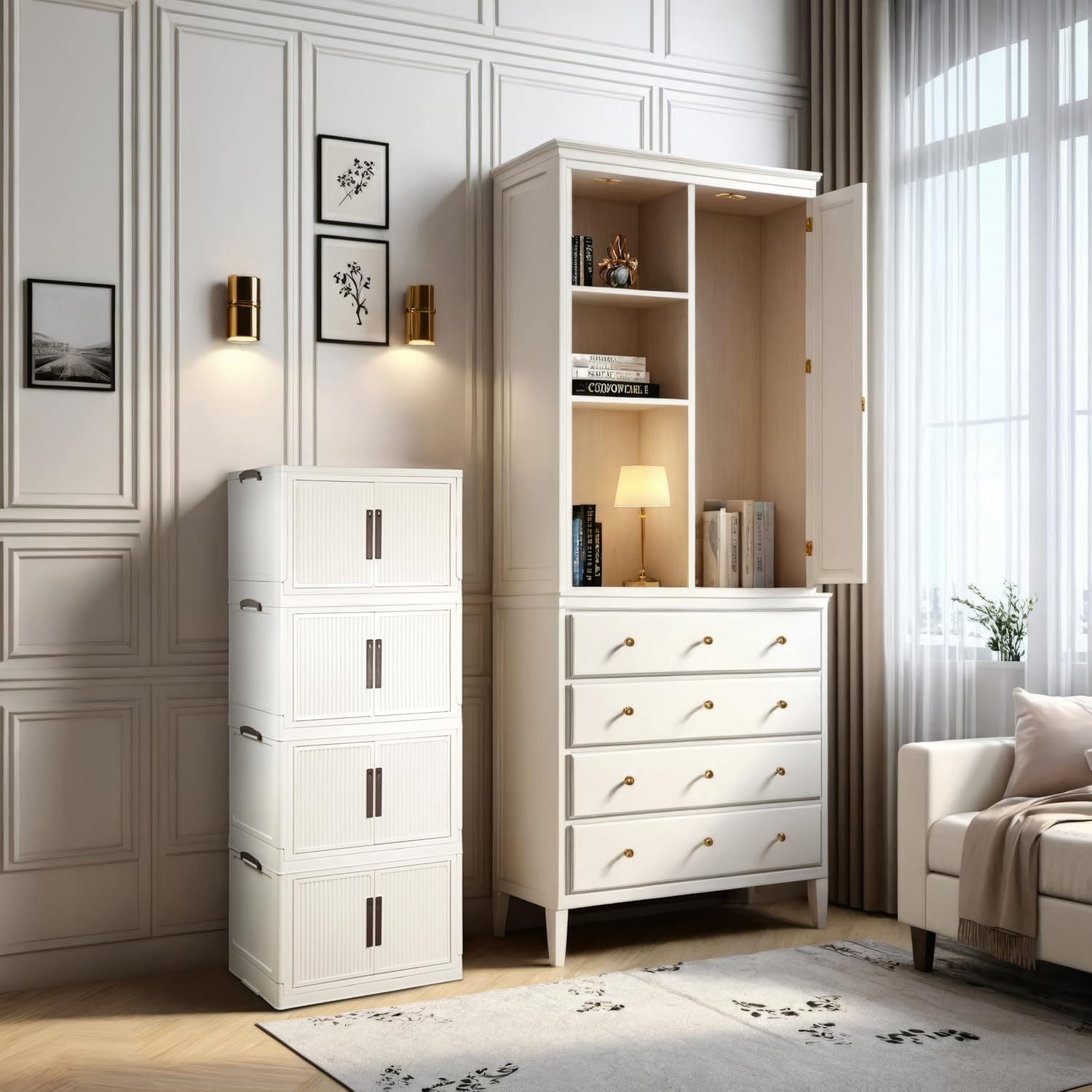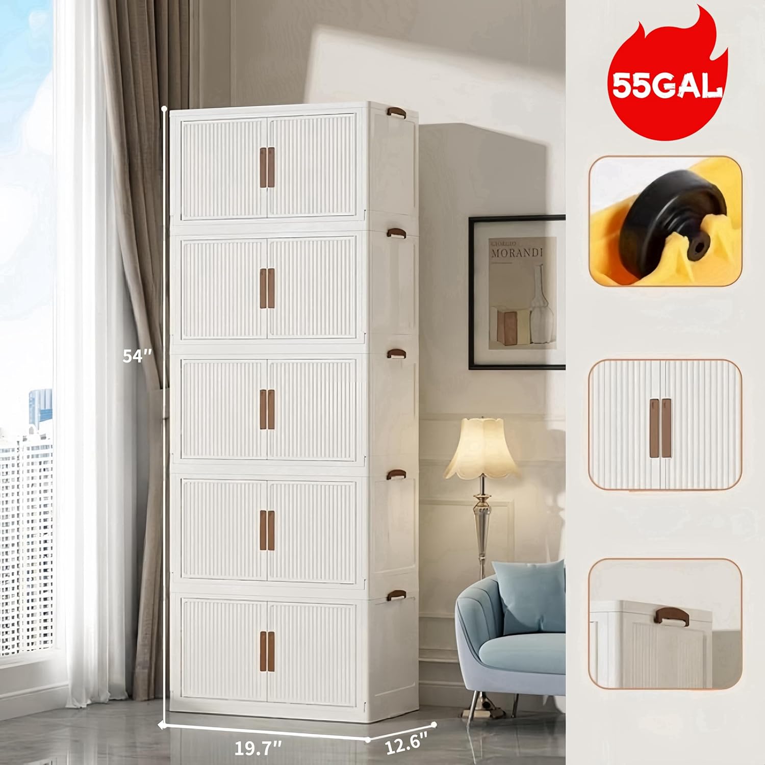 Stackable Storage Bins with Lid 55Gal/220QT Plastic Collapsible Storage Cabinet 5 Tiers Foldable clothes Organizers and Storage bins with Wheels and Doors for Home Office White