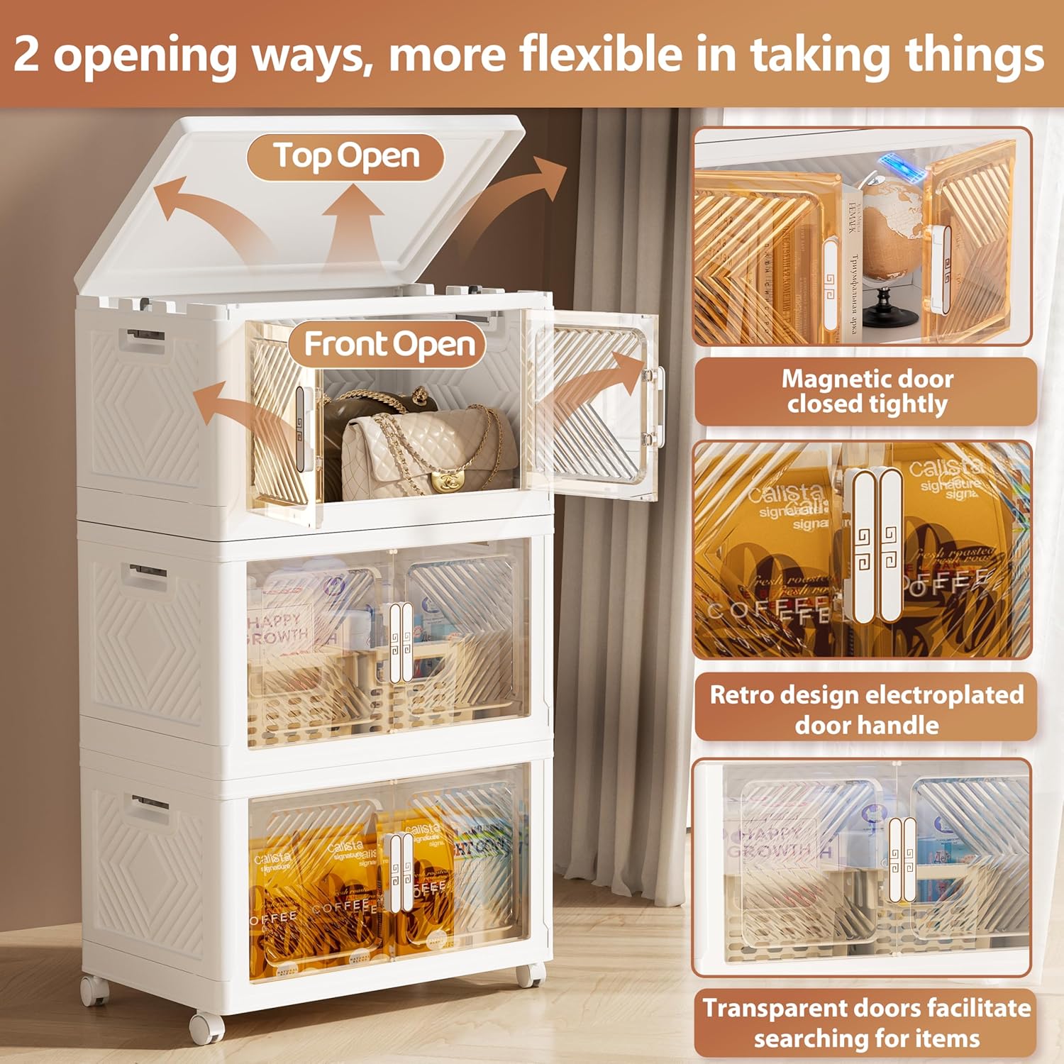 - 【Double Door & Visual Design】The storage boxes can be opened from the front doors and the top lid, 2 opening ways are convenient for retrieving items from different directions. The top lid makes it easy to quickly access large items, such as clothes and blankets. Powerful magnets are built into the front door to ensure that it will not automatically open. The door is made of transparent material, making the clear storage bins visible, so you can quickly find the items you need and save your time