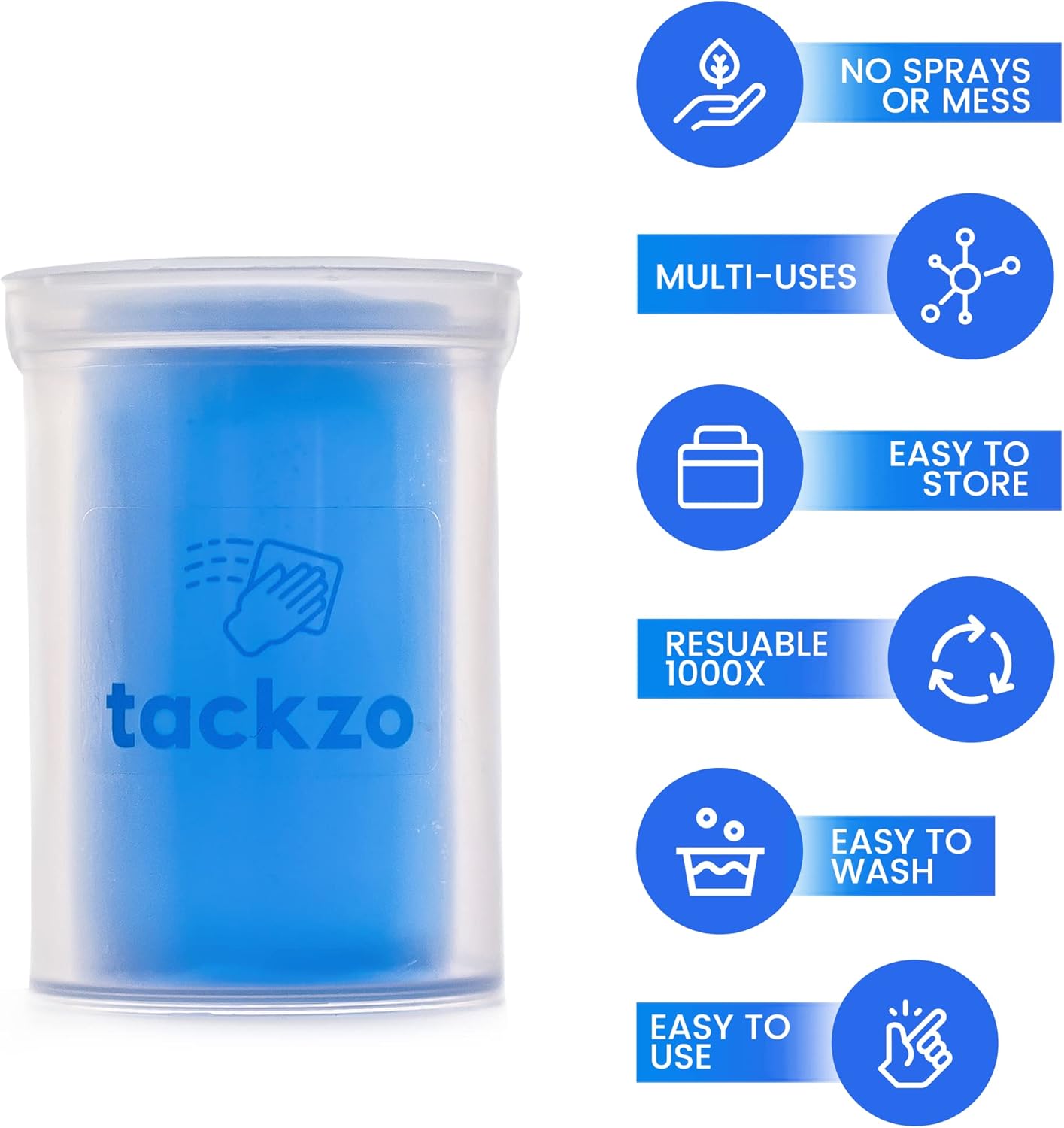 - [MULTI-PURPOSE CLEANING PRODUCT] Tackzo is a hand-held, multi-purpose cleaner that effectively collects debris, pet hair, crumbs, dust and more. Its unique formula allows it to be sticky yet not stick to your hands, allowing for easy cleaning and reuse. Simply roll, wash, and reuse for ongoing cleaning needs