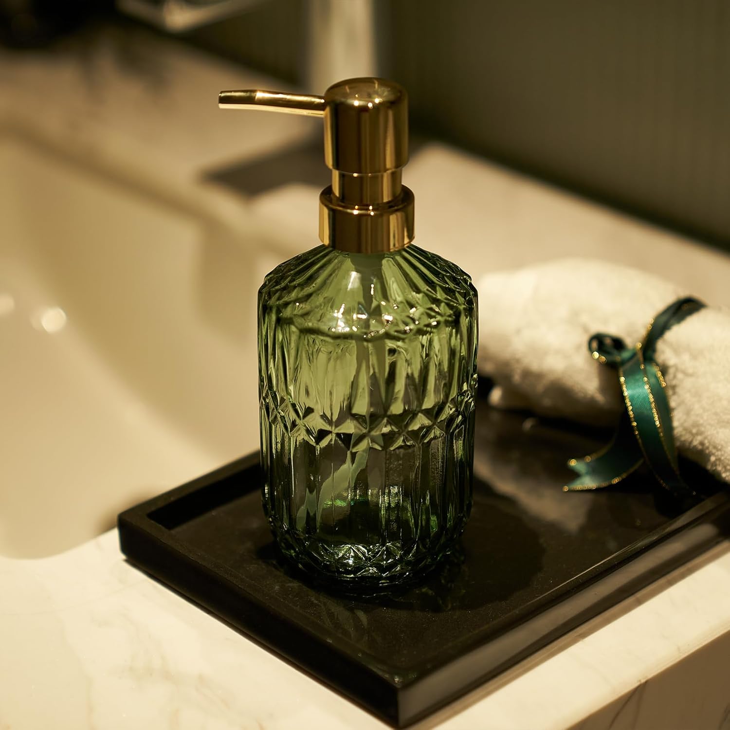 - 【Fashion & Functional Design】The green glass diamond design bottle with the gold plastic pump can make the soap dispenser in an elegant high end look. It can easy match other home decor. It can be a helpful kitchen soap dispenser or a fashionable decor for bathroom. Complements any decor with its chic appearance.