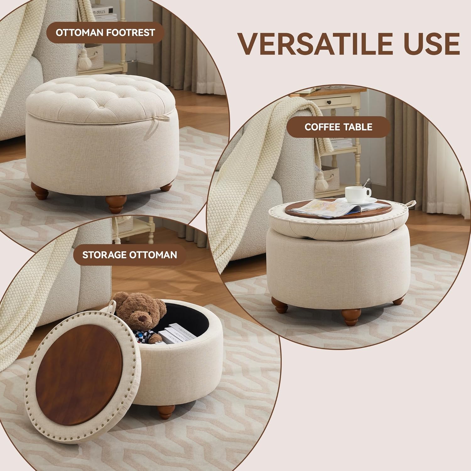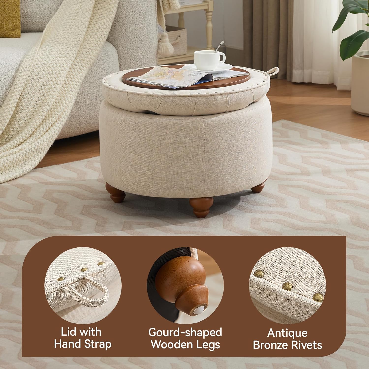 - Premium Material:Circle ottoman is made of high-quality linen fabric, which is soft and breathable. The wooden cover has a natural texture and a smooth and waterproof surface. It can be used as a coffee table, had a fine craftsmanship, simple design, and spacious storage space, combining beauty and practicality.
