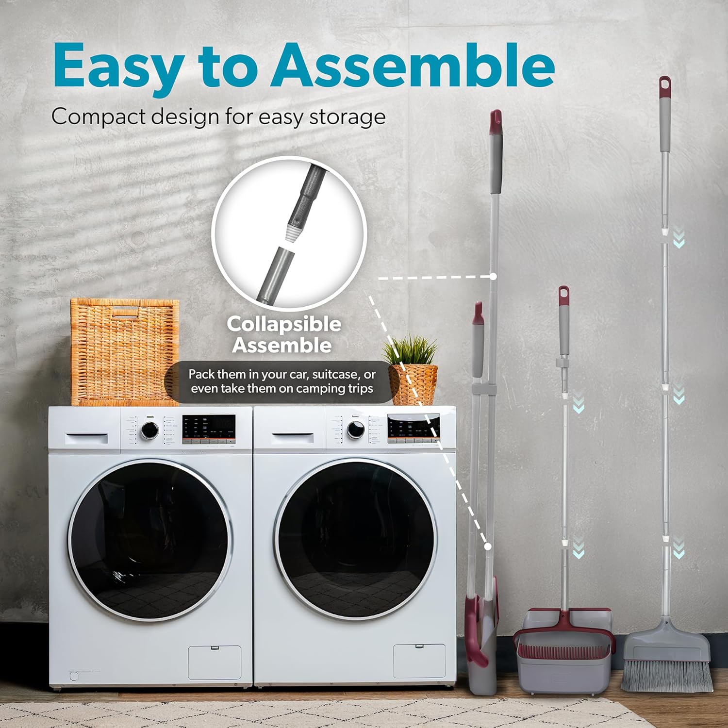 - Durable Construction: Made from high-quality materials, the broom and dustpan are built to last, withstanding repeated use without losing its effectiveness. Ergonomic Design: The broom and dustpan have an ergonomic design that ensures comfortable use for extended periods. The broom handle is long enough to accommodate users of different heights, reducing back strain.