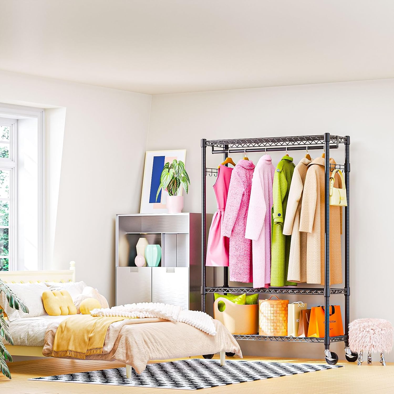 - Effortless Mobility and Stability : Equipped with four 360° rotating wheels, this rolling clothes rack moves smoothly across different spaces—bedroom, laundry room, garage, or entryway. Two lockable wheels provide extra stability when needed