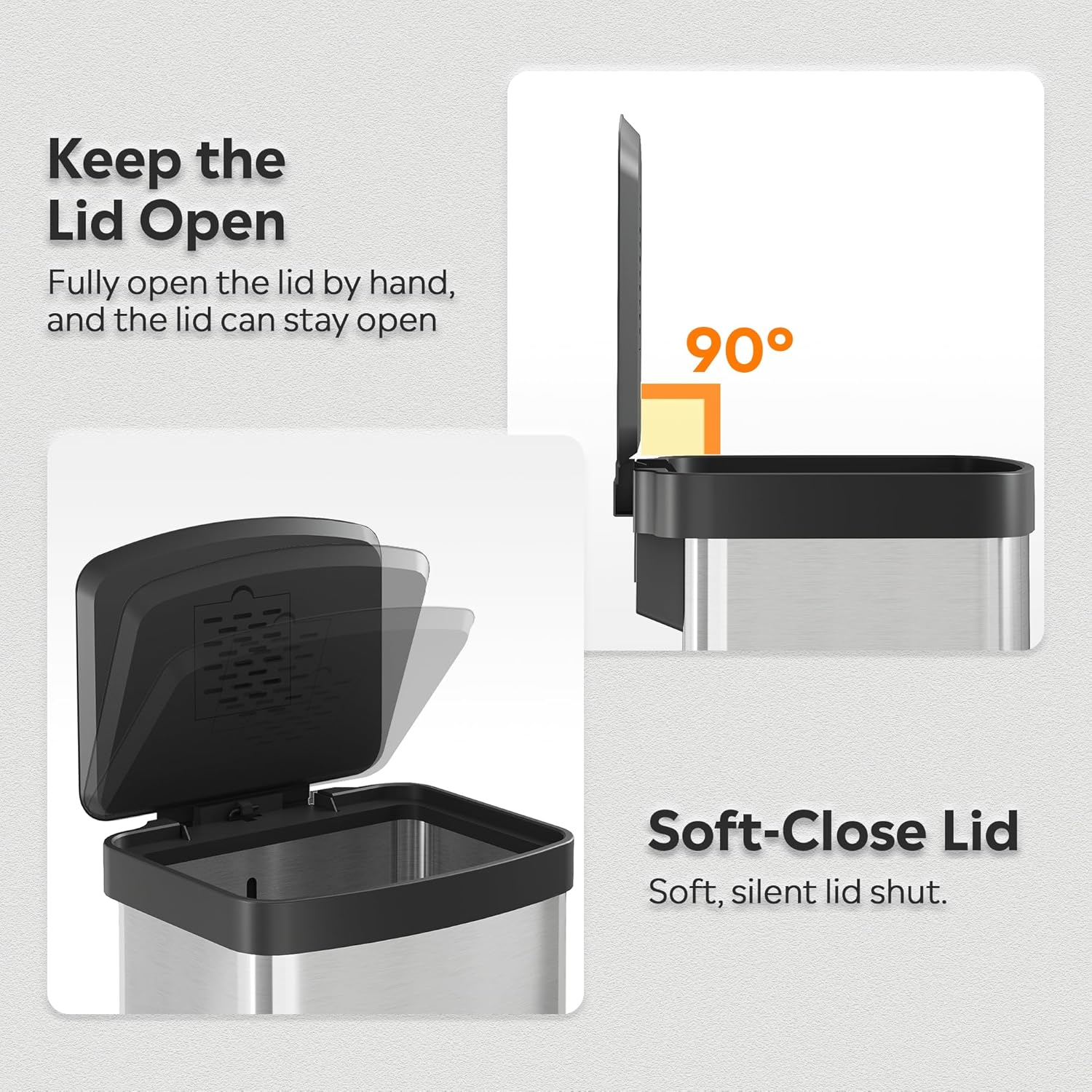 - 【Soft-Close Lid】The kitchen trash can features gentle, silent lid closure thanks to a built-in slow-drop mechanism—no loud slams to disturb family or pets. Smooth motion extends lid lifespan by reducing wear and tear on hinges.