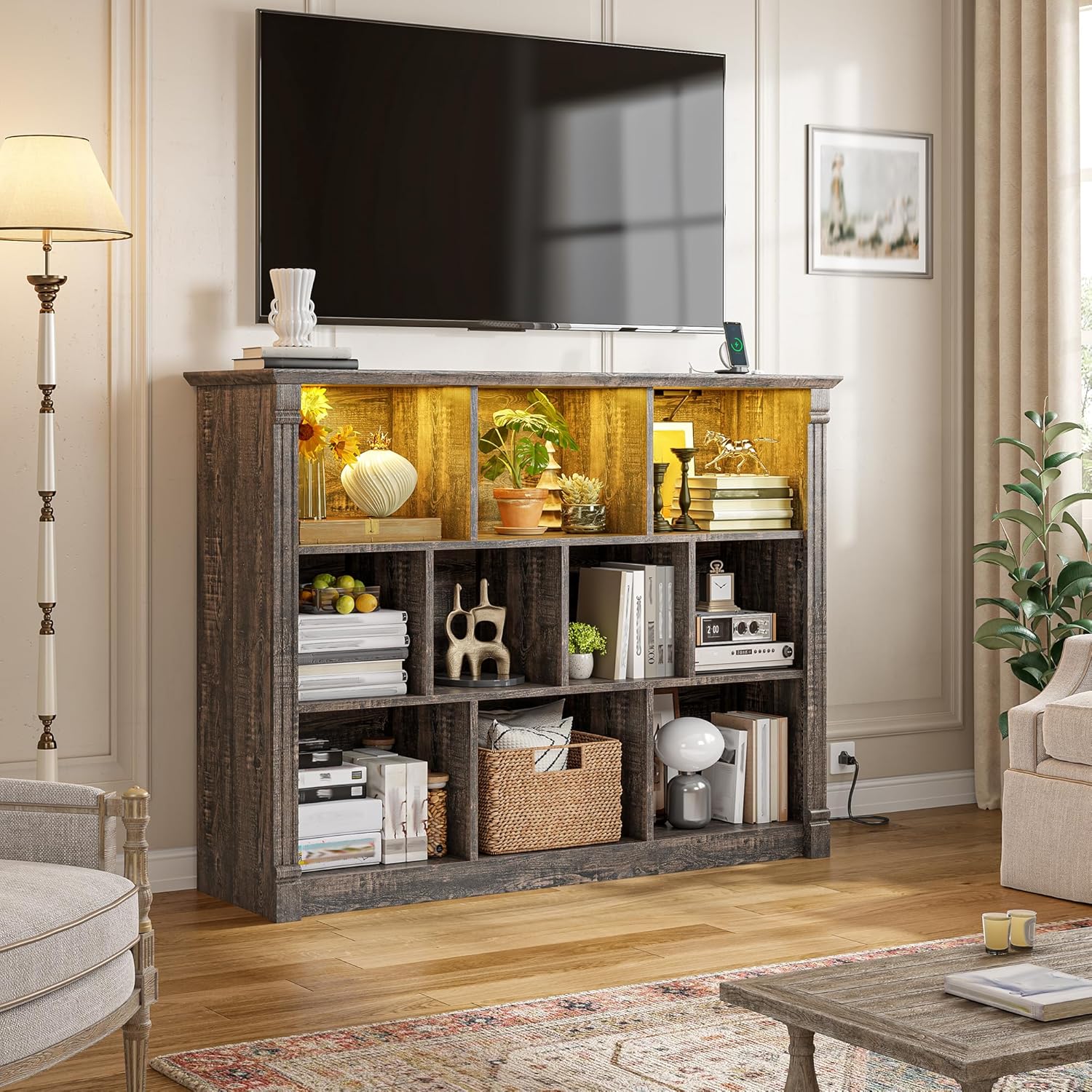 EnHomee 10 Cube Storage Organizer with LED Light and Charging Station Wood Cube Shelf Display Cabinet for Bedroom Living Room,Office,Black Oak