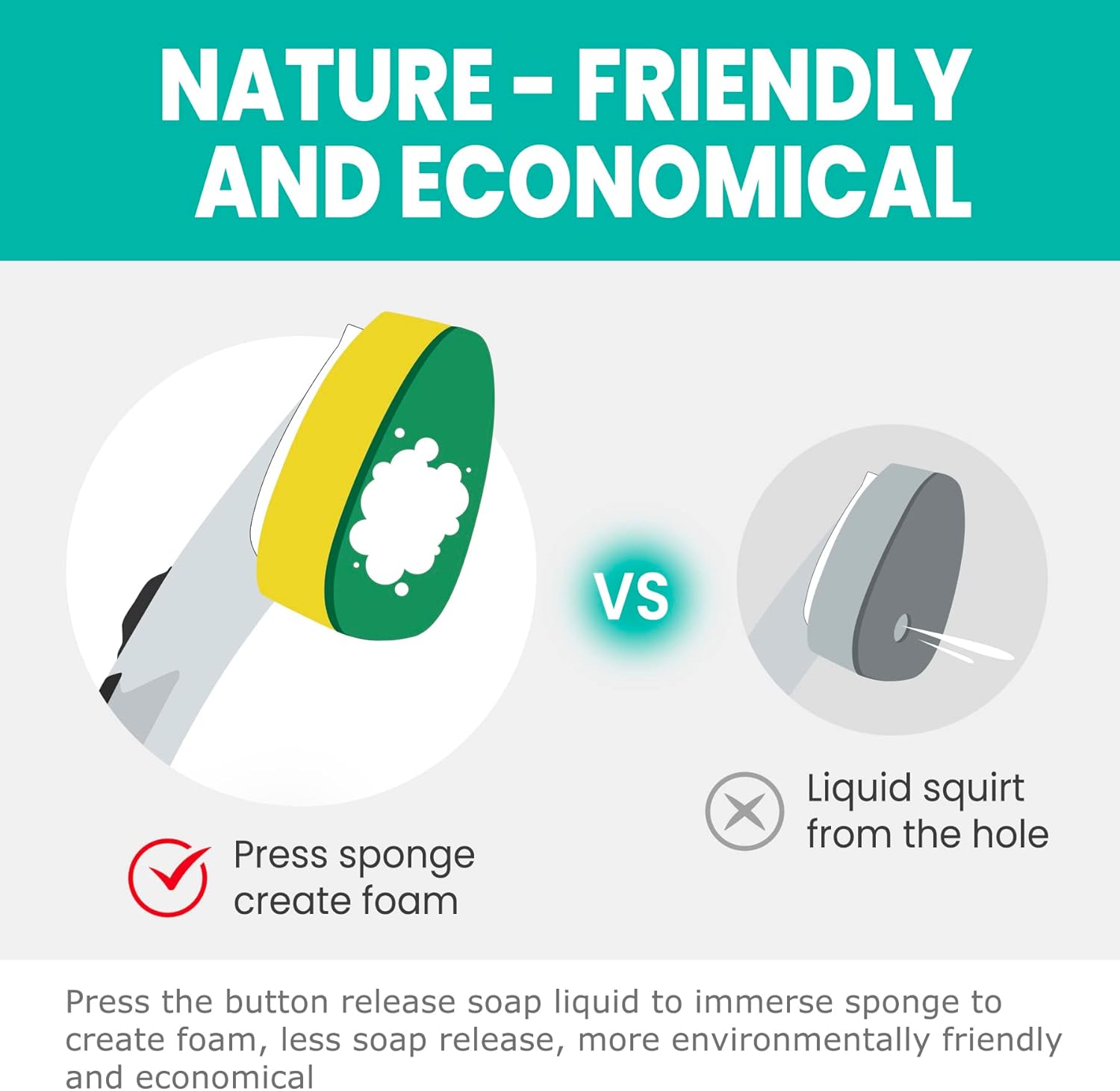 - Immerse Instead of Spraying Soap: We have eliminated the hole in the sponge's middle to prevent liquid leakage. For the first use, press the handle button about 10 times to soak the soap into the sponge, which will generate rich foam,making wiping easier