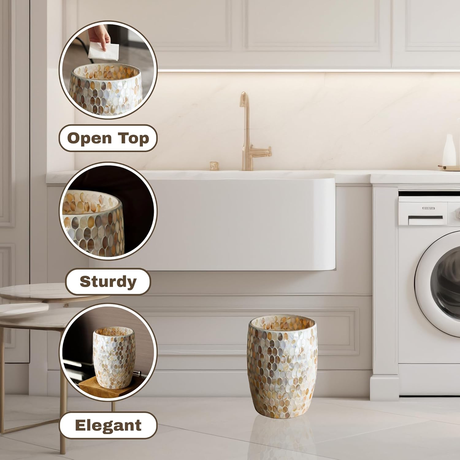 Escenzy Natural Shell Bathroom Trash Can Mosaic Glass 5L | Decorative Small Garbage Can | 7" x 10" | Luxury Waste Basket for Restroom, Office, Bedroom & Kitchen | Shiny Glass Bathroom Accessories