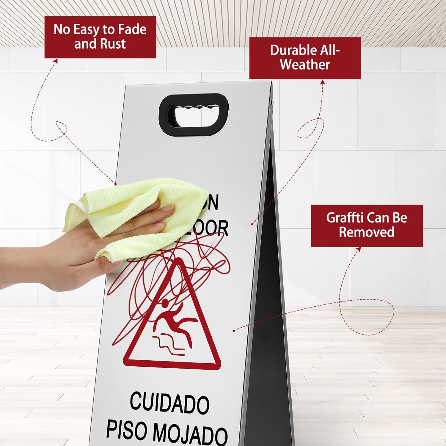 - Portable Handle Design: our stainless steel heavy floor caution sign is equipped with a portable handle design; This user-friendly feature ensures that the wet floor sign is easy to set up and move around