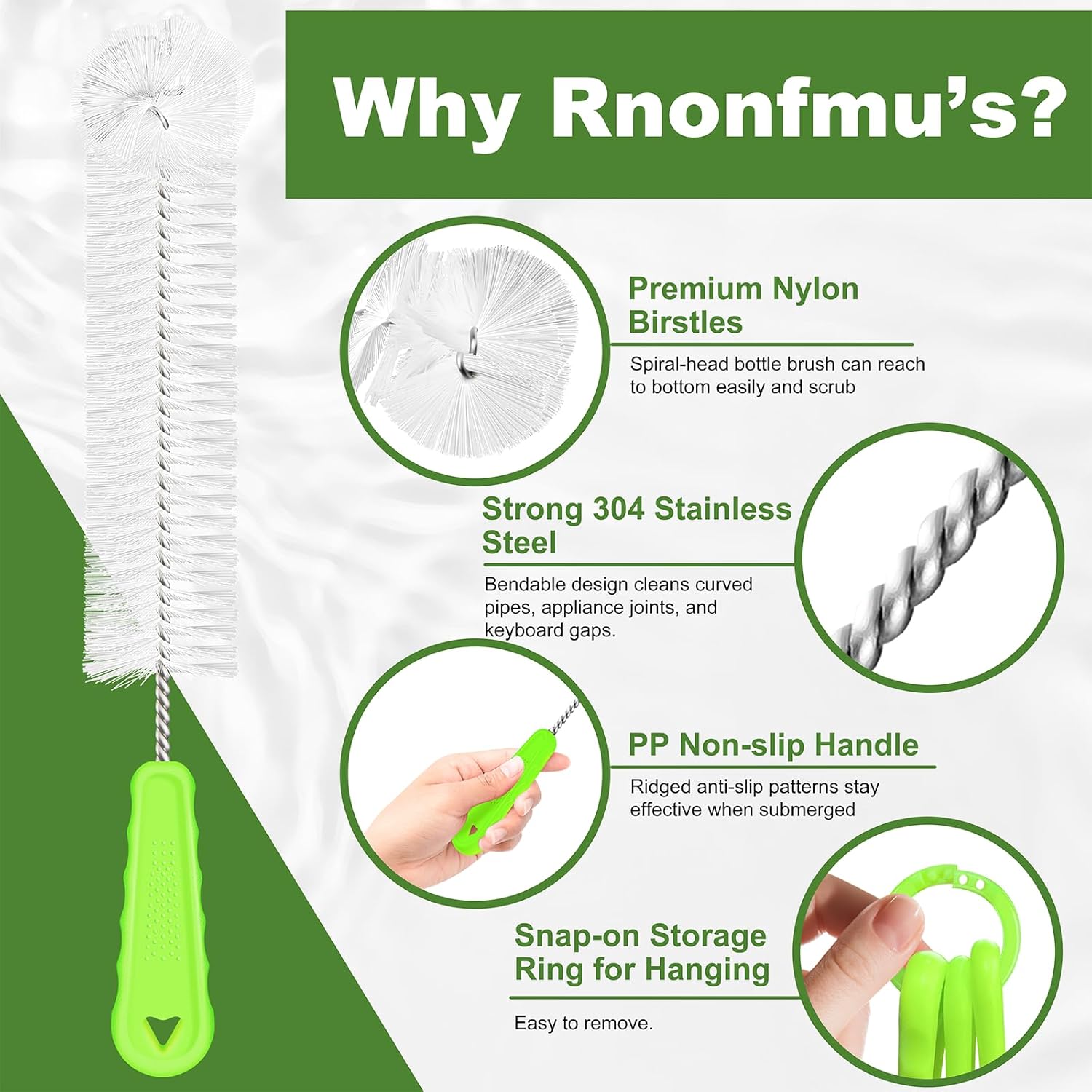 - Comfort Grip Handle: The ergonomic non-slip handles of Rnoafmu bottle brush cleaner crafted with premium PP material and rustproof stainless steel cores for fatigue-free scrubbing. Ridged anti-slip patterns stay effective when submerged – no slipping during deep-cleaning sessions. Embedded metal rod prevents handle warping, ensuring remove stubborn stains easily.
