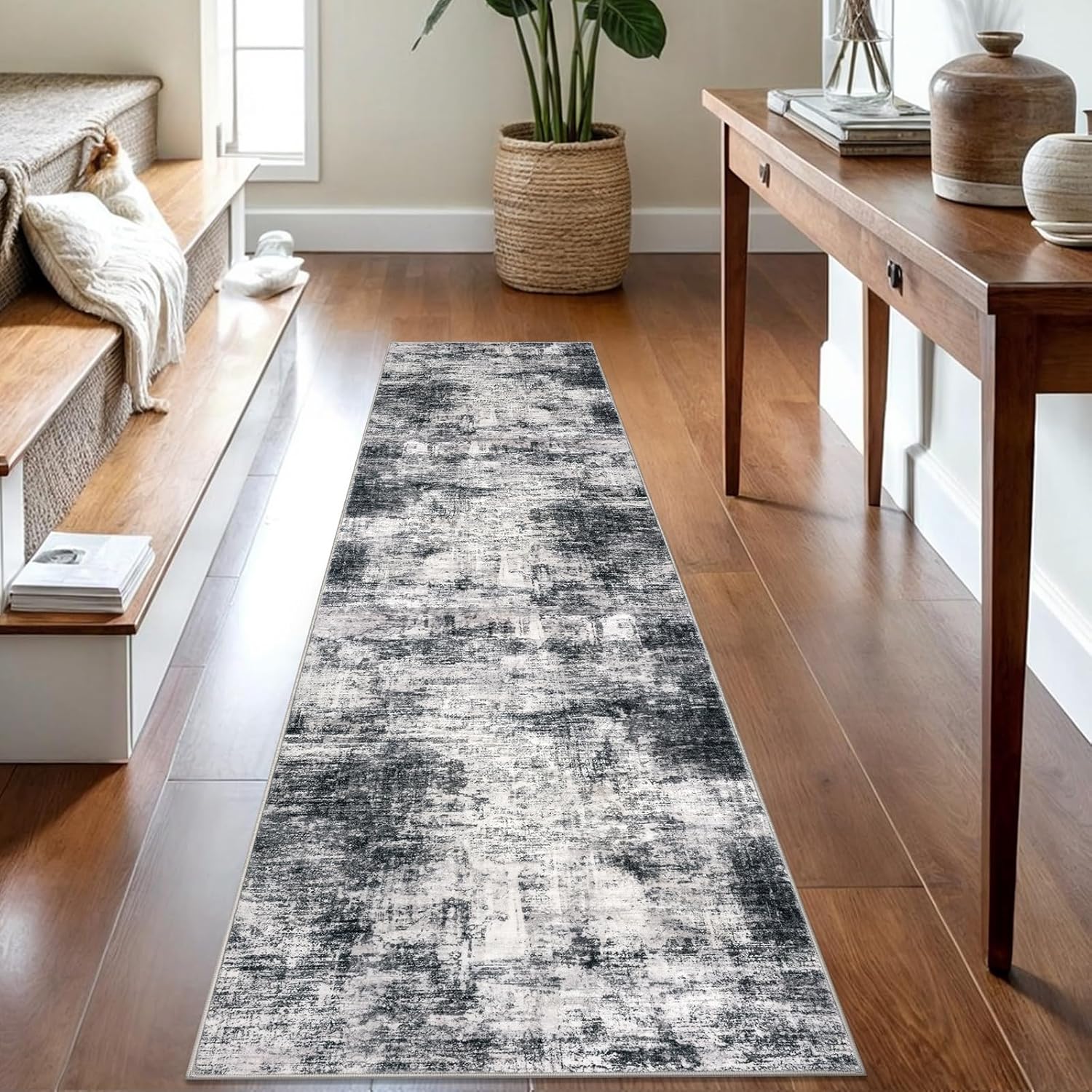 IOHOUZE Abstract Runner Rug 2x8 Ft Washable Runners for Hallways, Non Slip Kitchen Runner Printed Faux Wool Entryway Runner Indoor, Modern Abstract Floor Carpet for Hall Kitchen Bedroom, Black Gey