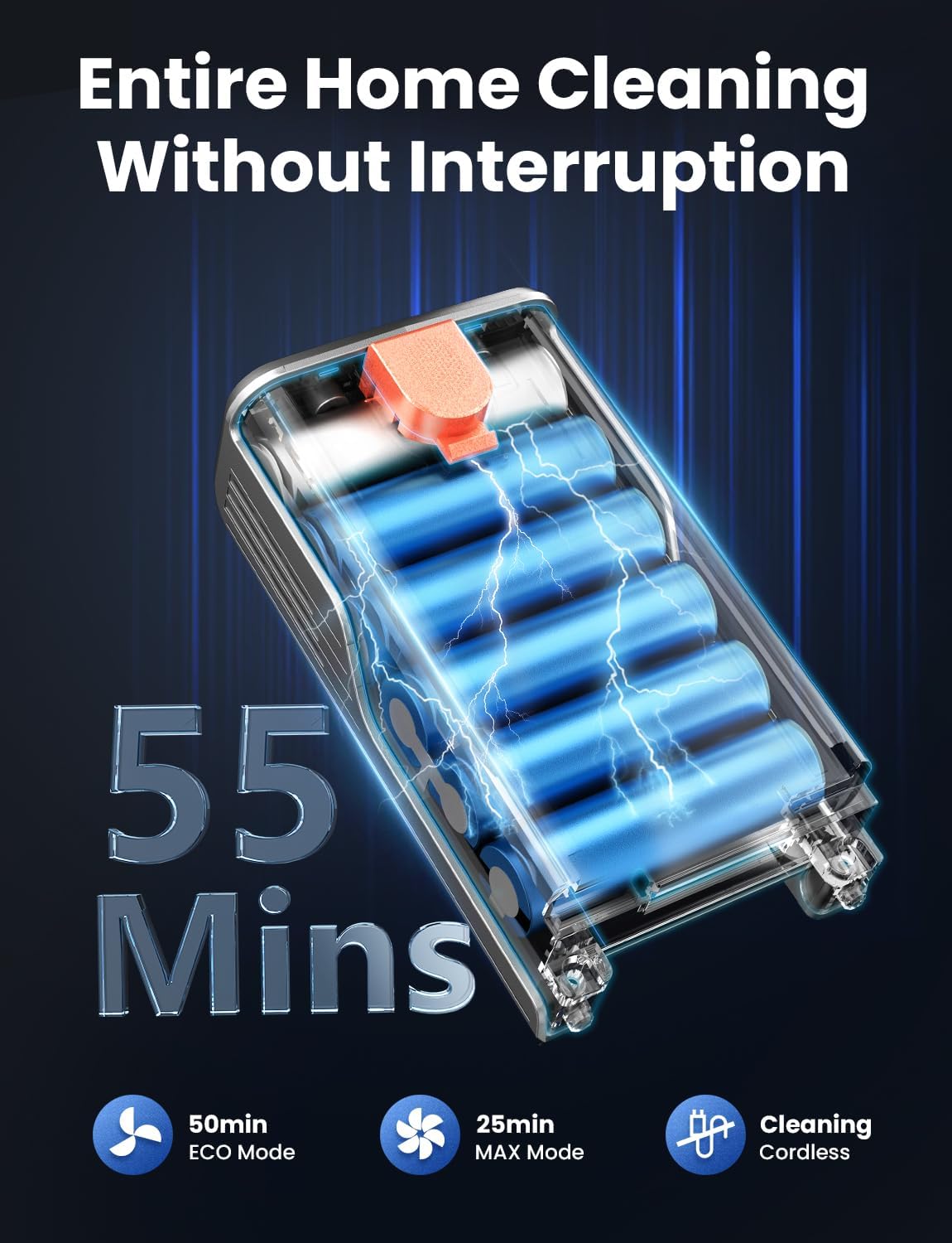 - 𝟱5𝗠𝗶𝗻𝘀 𝗥𝘂𝗻𝘁𝗶𝗺𝗲 𝘄𝗶𝘁𝗵 𝗥𝗲𝗺𝗼𝘃𝗮𝗯𝗹𝗲 𝗕𝗮𝘁𝘁𝗲𝗿𝘆: S2 cordless vacuum includes a 6x2500mAh detachable battery that provides up to 55 minutes of cleaning on Eco Mode, and 25 minutes on Max Mode. Easily swap batteries and recharge for extended use without interruption.