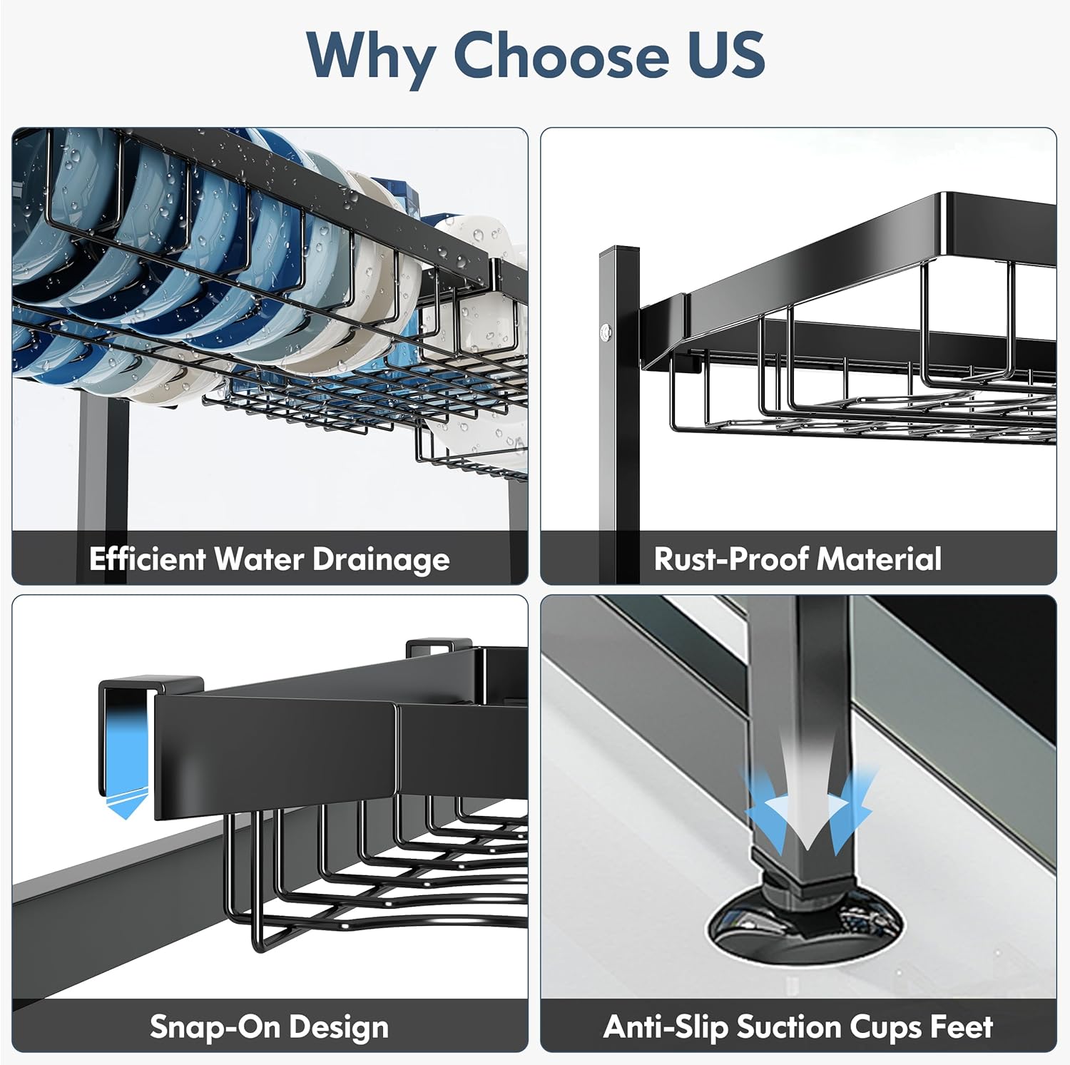 - 🔩 Sturdy & Rust Resistant Construction: Crafted with heavy duty stainless steel and reinforced welding, this over the sink dish drainer drying rack resists corrosion and daily wear. Its industrial grade framework securely holds bulky pots, pans, and dishware without sagging, even when fully loaded, ideal for families seeking a lasting solution to countertop clutter