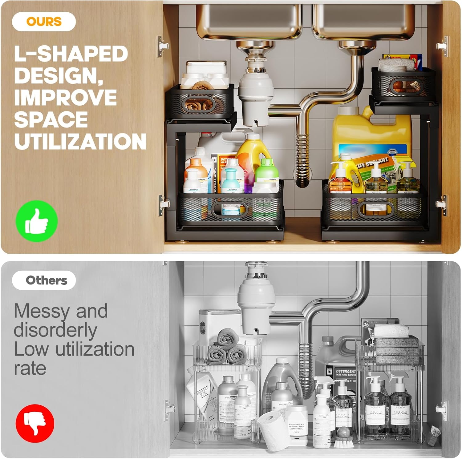 - 【Transform Your Space with Dual Pull-Out Design】 Discover the efficiency of our 2-Pack Under Sink Storage Organizer! Featuring an innovative dual pull-out design, both tiers glide open for quick and easy access to your essentials. Whether you’re organizing cleaning supplies or personal care items, the 2-Tier Slide Out Drawer helps maintain a neat and tidy home, making your daily routine more manageable.