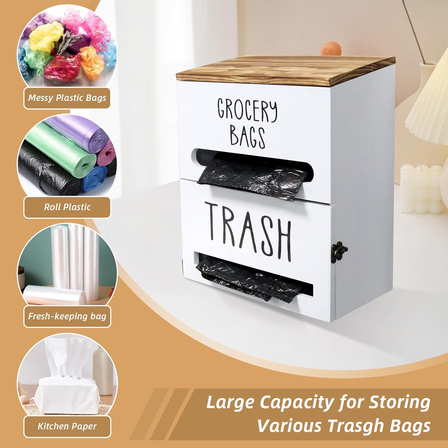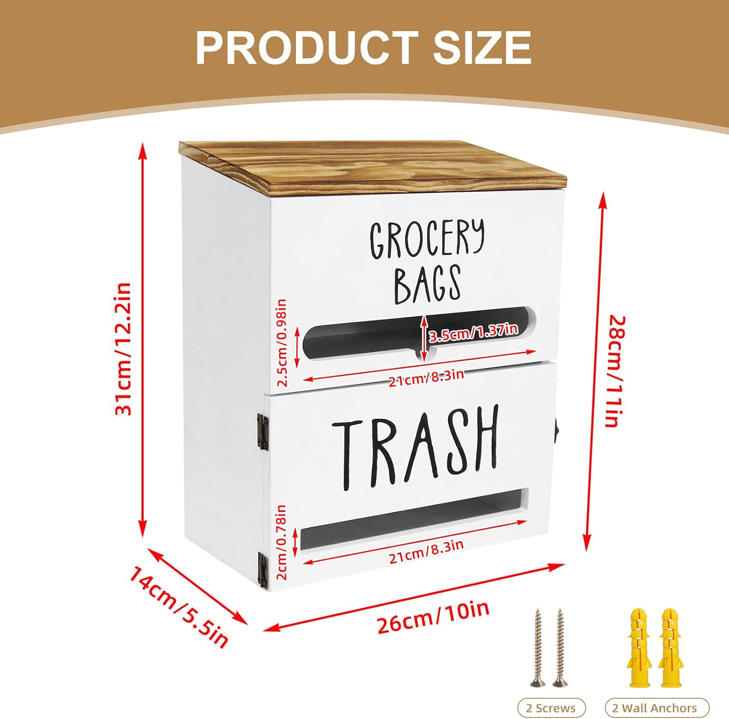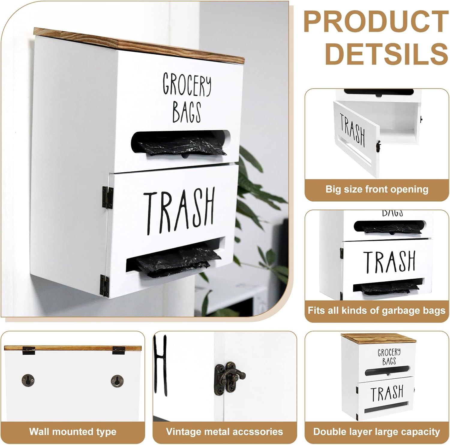 2 in 1 Trash Bag Dispenser, Double Wall Mounted,Wood Trash Bag Holder, used in kitchen, garage, laundry room, can store Environmentally friendly food bags and garbage bags (White)