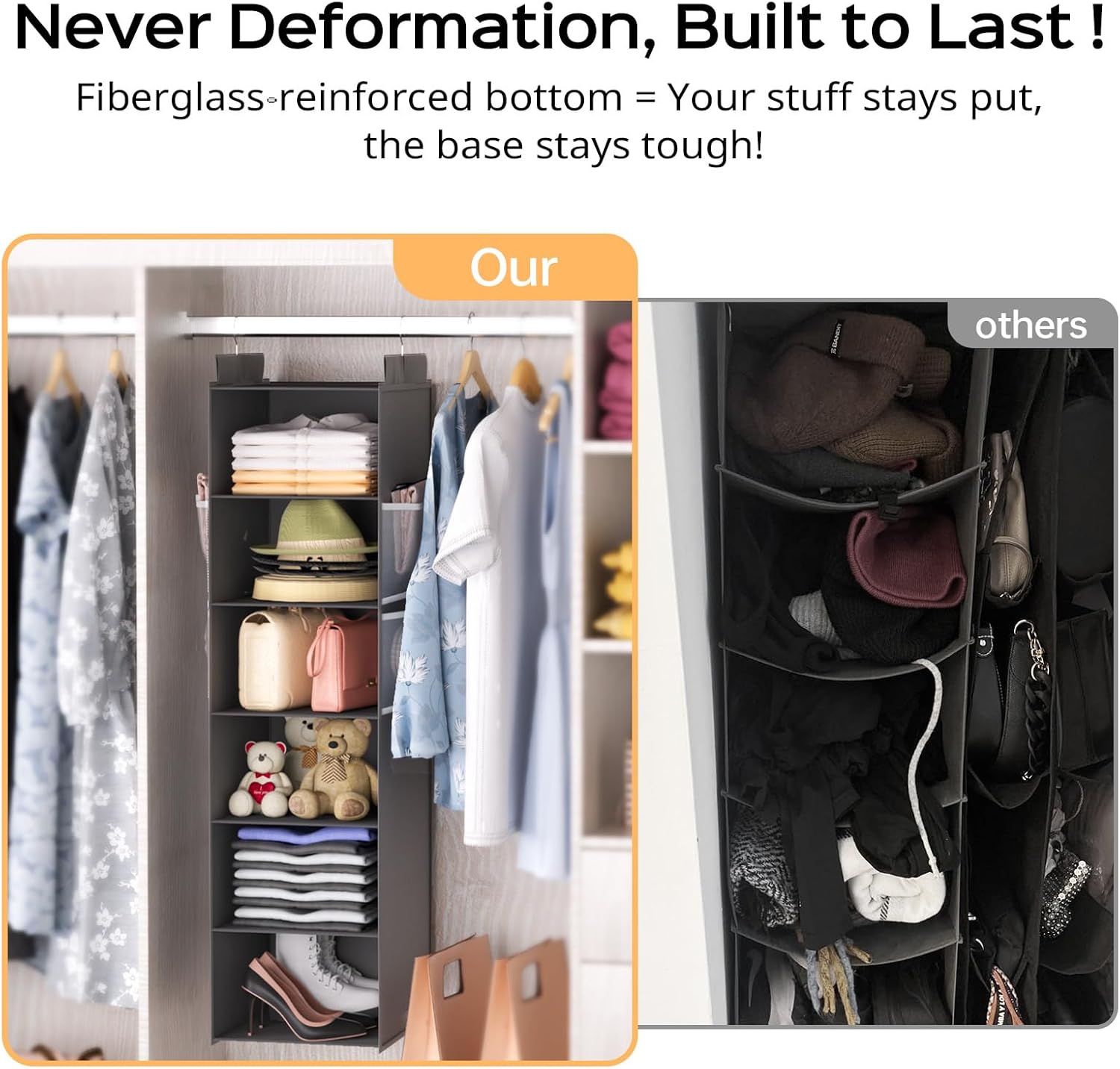 Extra Deep Hanging Closet Organizer with 6 Shelves and Oversized Mesh Pockets, Heavy-Duty Structure, No Deformation, Max Storage for Clothes, Shoes, Hats, Dorms and RVs, Grey,1-Pack