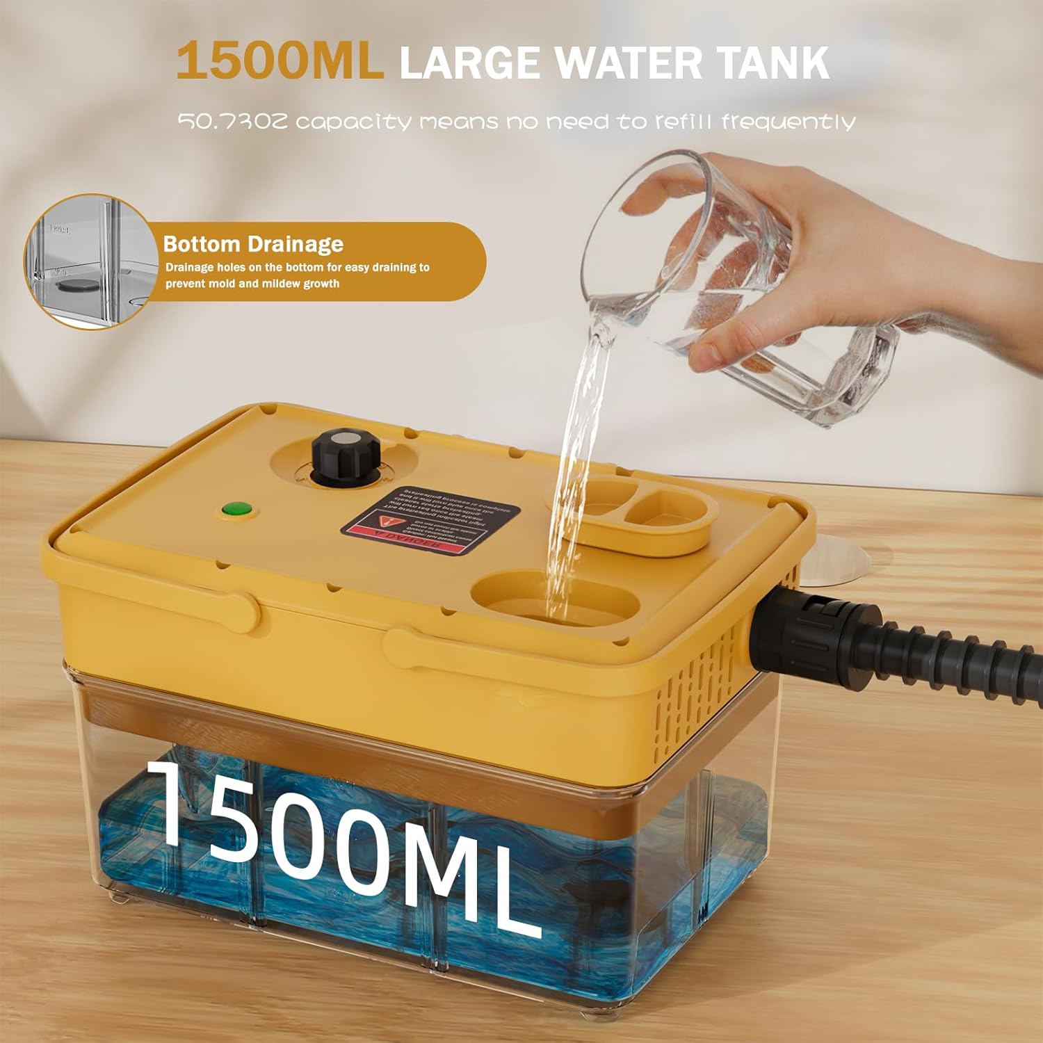 • 50.73OZ Large Tank & Continuous Cleaning: Enjoy 25~60 minutes of non-stop cleaning with the 50.73OZ (1500ML) water tank—no frequent refills!The top design allows you to refill the tank at any time,and the bottom drain allows you to drain the remaining water when you are done cleaning.The water tank is made of translucent,high-strength material that allows the user to monitor the water level easily.