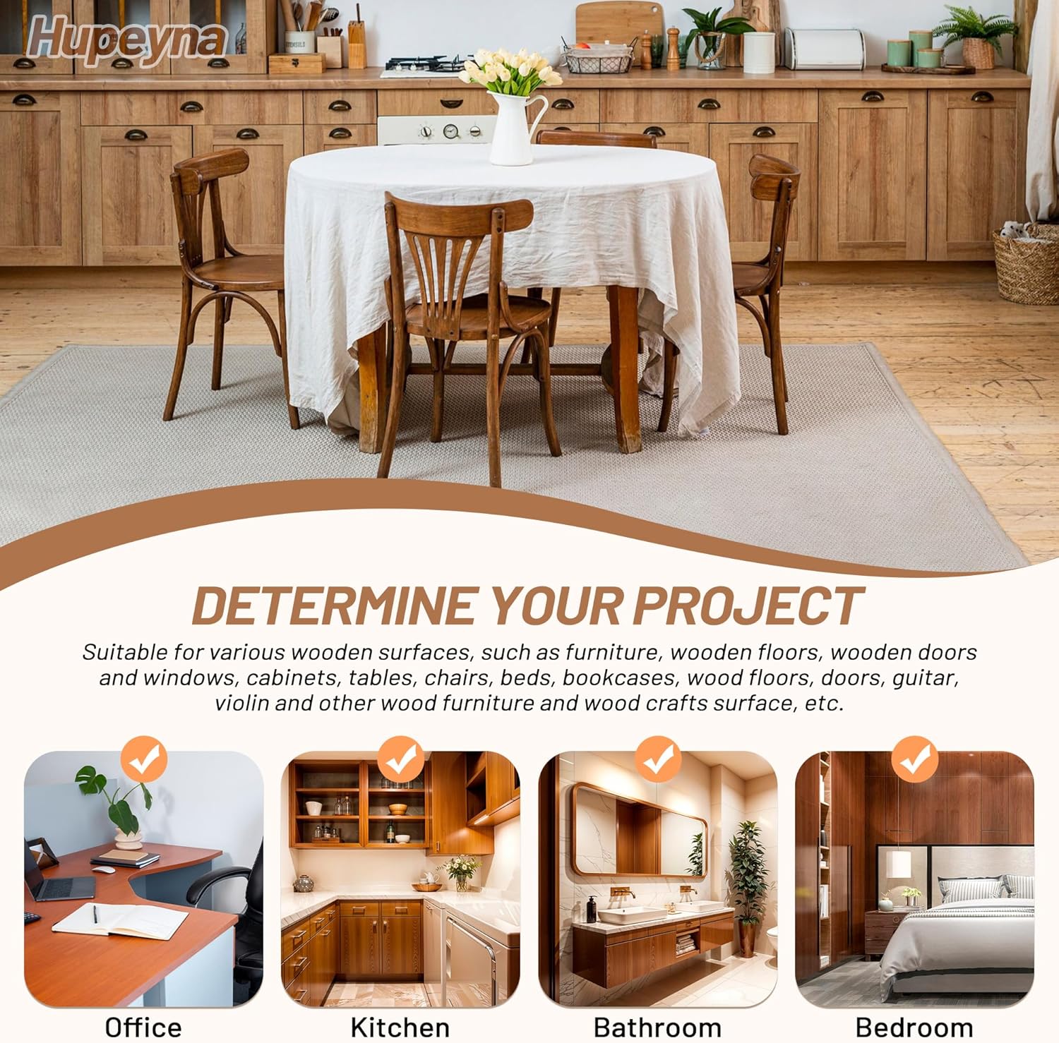 - Fully functional Hupeyna wood repair kit for wood furniture. Deep Repair (Wood Putty) Premium wood filler putty seamlessly fills deep scratches, dents and holes in wood furniture and flooring. Surface Coloring (Repair Wood Filler) Newly upgraded 5 colors to choose: white/black/amber yellow/yellow sandalwood/cedar. Care and Maintenance (Hupeyna Wood Furniture Polish) Beewax Wood Furniture Polish can be used on both finished and unfinished wood surfaces.