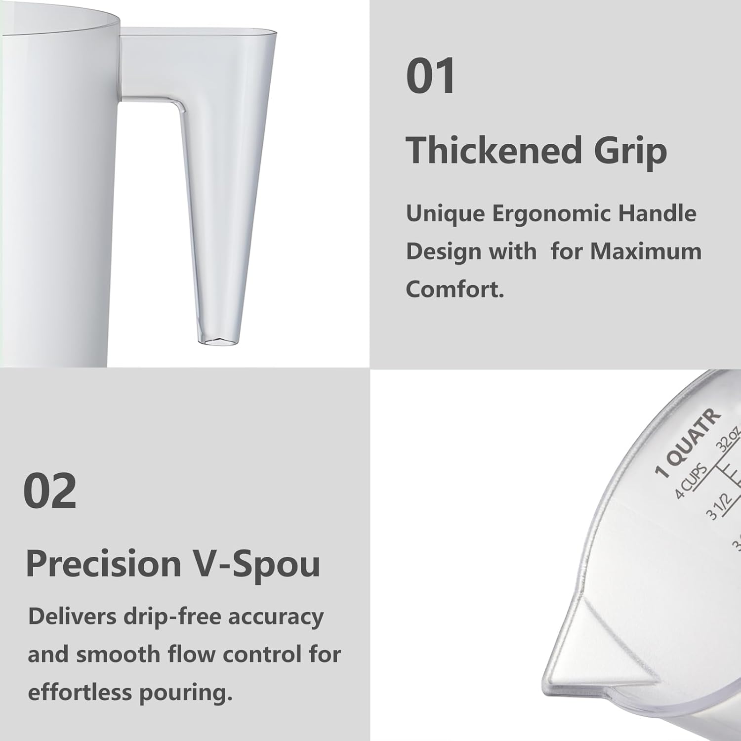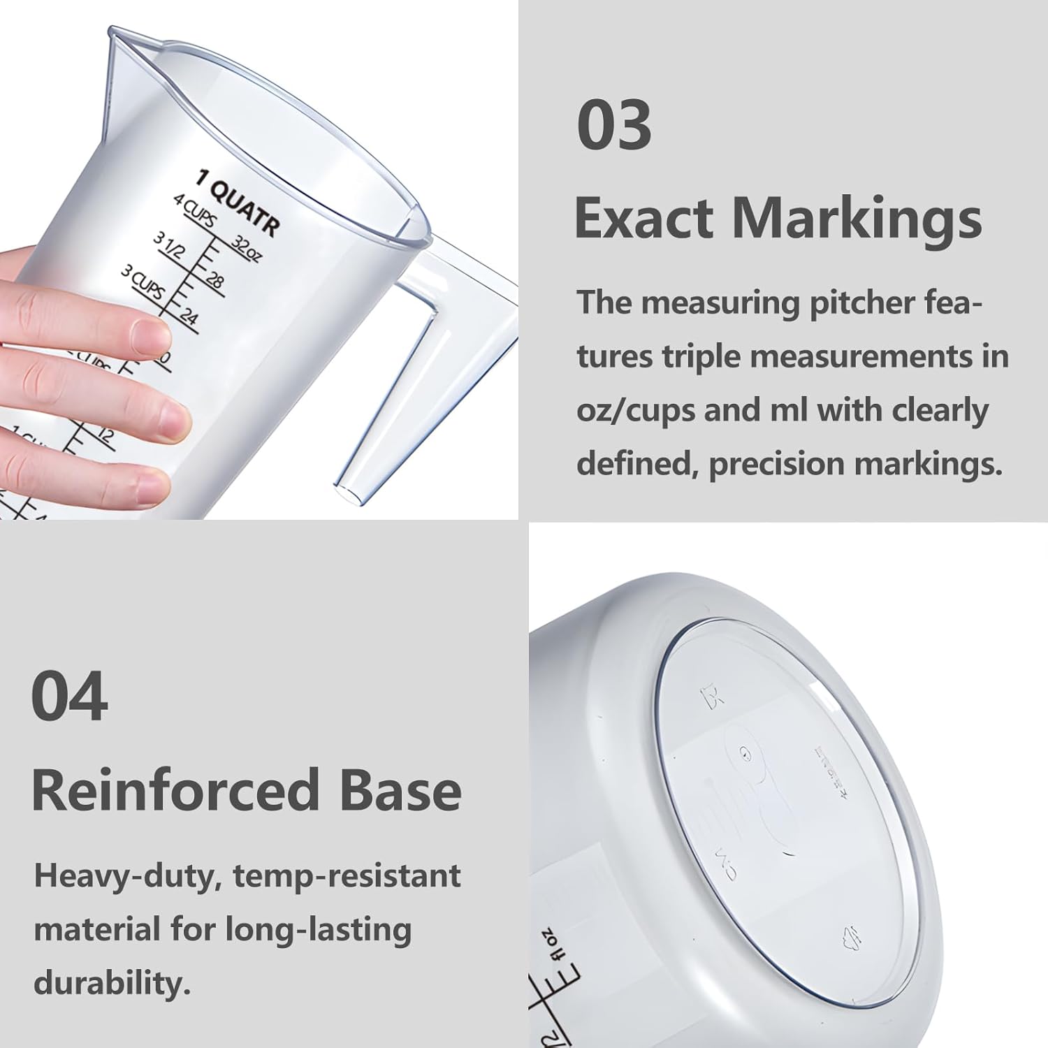 - Choose your ideal plastic measuring pitcher in 4 sizes: 32oz (1000ml/4cup) Measuring Pitcher: Compact for baking & small batches. 64oz (2000ml/8cup) Measuring Pitcher: Multi-purpose for kitchens & labs. 120oz (3500ml/15cup) Measuring Pitcher: Bulk handling for agriculture or catering. 160oz (5000ml/21cup)large measuring pitcher: Industrial-grade for pool maintenance, soap making.