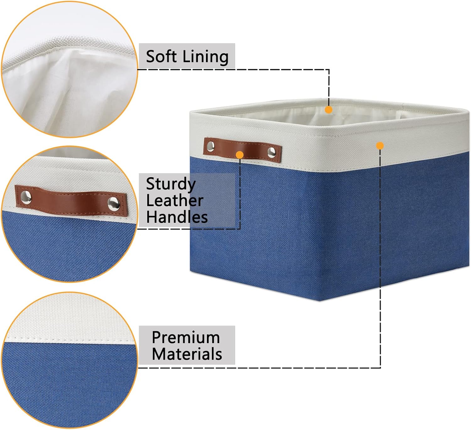 - 【PREMIUM MATERIAL】The medium storage basket is made with sturdy extra thick linen cationic fabric exterior and linen polyester interior lining. Strong upper metal keeps the shape and structural. The handles are made of premium quality leather and fixed on both sides of the basket by rivets.