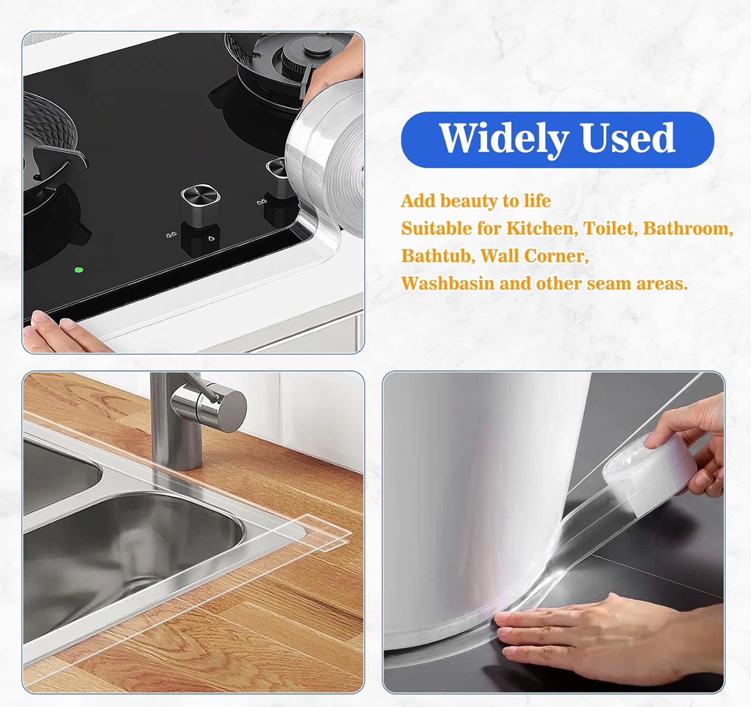 - ✅Wide Applications: Self-adhesive clear caulk strip sealant tape is widely used for sealing joints in kitchen, toilets, bathroom, sinks, pools, bathtubs, gas stoves and walls. The shower tape caulk strip can prevent them from blackening and keep your kitchen and bathroom clean and tidy.