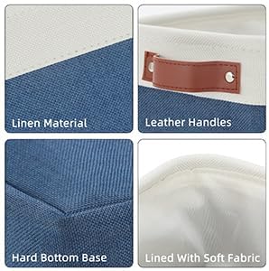 - 【PREMIUM MATERIAL】The small storage basket is made with 2.5mm sturdy extra thick linen cationic fabric exterior and linen polyester interior lining. Strong upper metal keeps the shape and structural. The handles are made of premium quality leather and fixed on both sides of the basket by rivets.