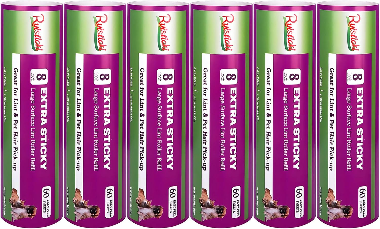 8 inch Large Surface Roller Refill Compatible with Scotch-Brite Pet Hair Pickup Extra Sticky Large Lint Roller Replacement 60 Easy-Tear Adhesive Sheets per Refill Pack of 6 Rolls 360 Sheets Total