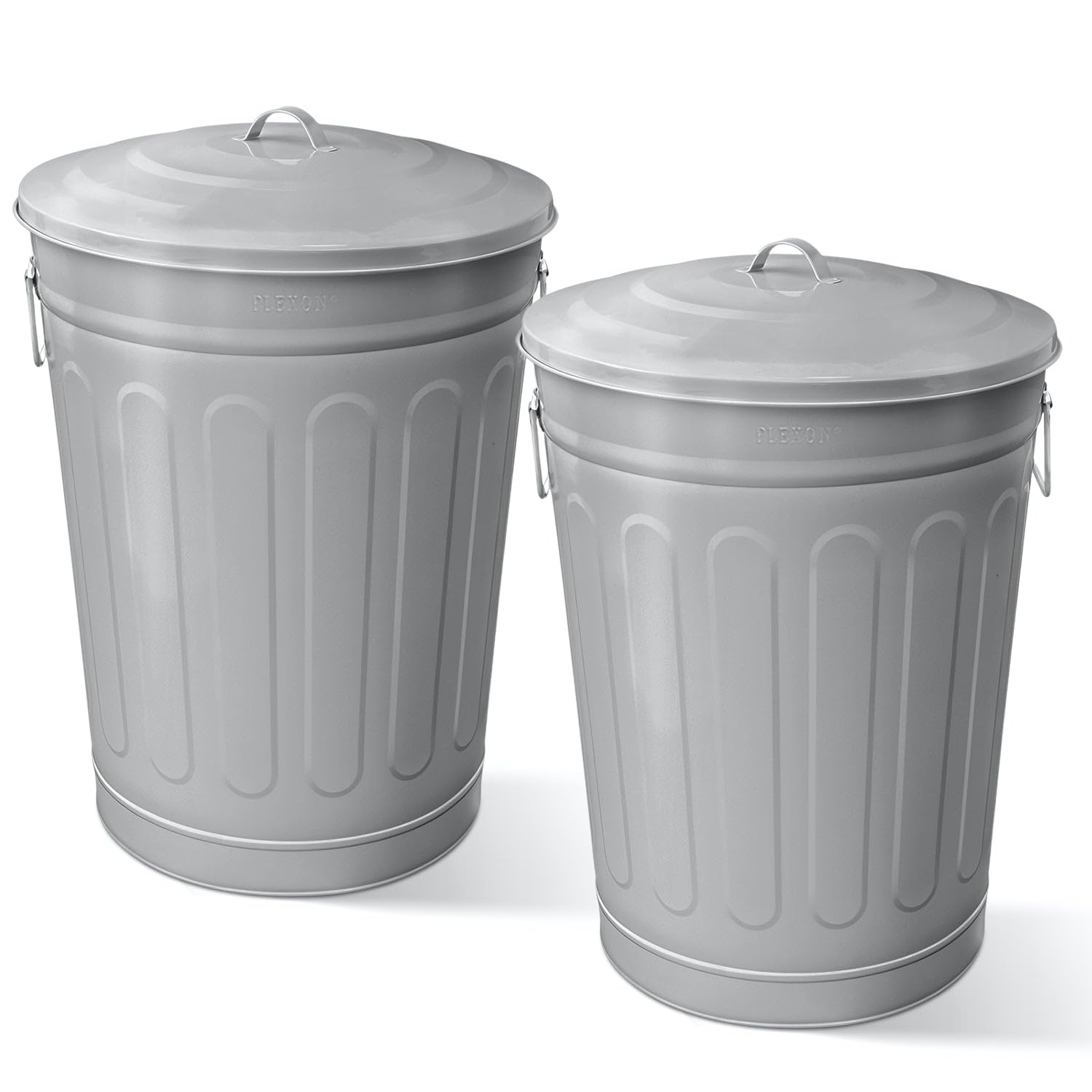 Plexon Round Trash Can 13 Gallon, Vintage Metal Outdoor Trash Can with Lid, Retro Farmhouse Garbage Container, Old School Modern Ash Bucket, Gray 2 Pack