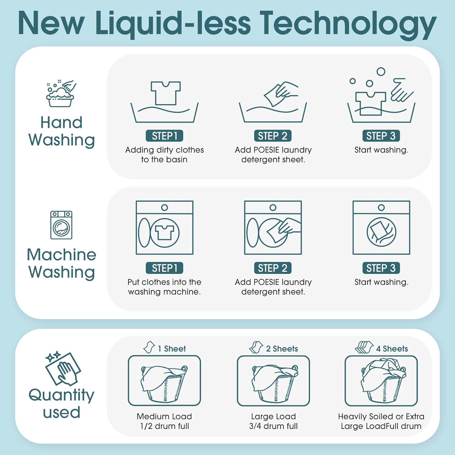 - Easy to Use - Liquidless detergent sheets, 1 sheet for small or medium loads where clothes are not very dirty, 2 sheets for large loads and 4 sheets for extra large loads, no waste. Not too little and not too much to save resources