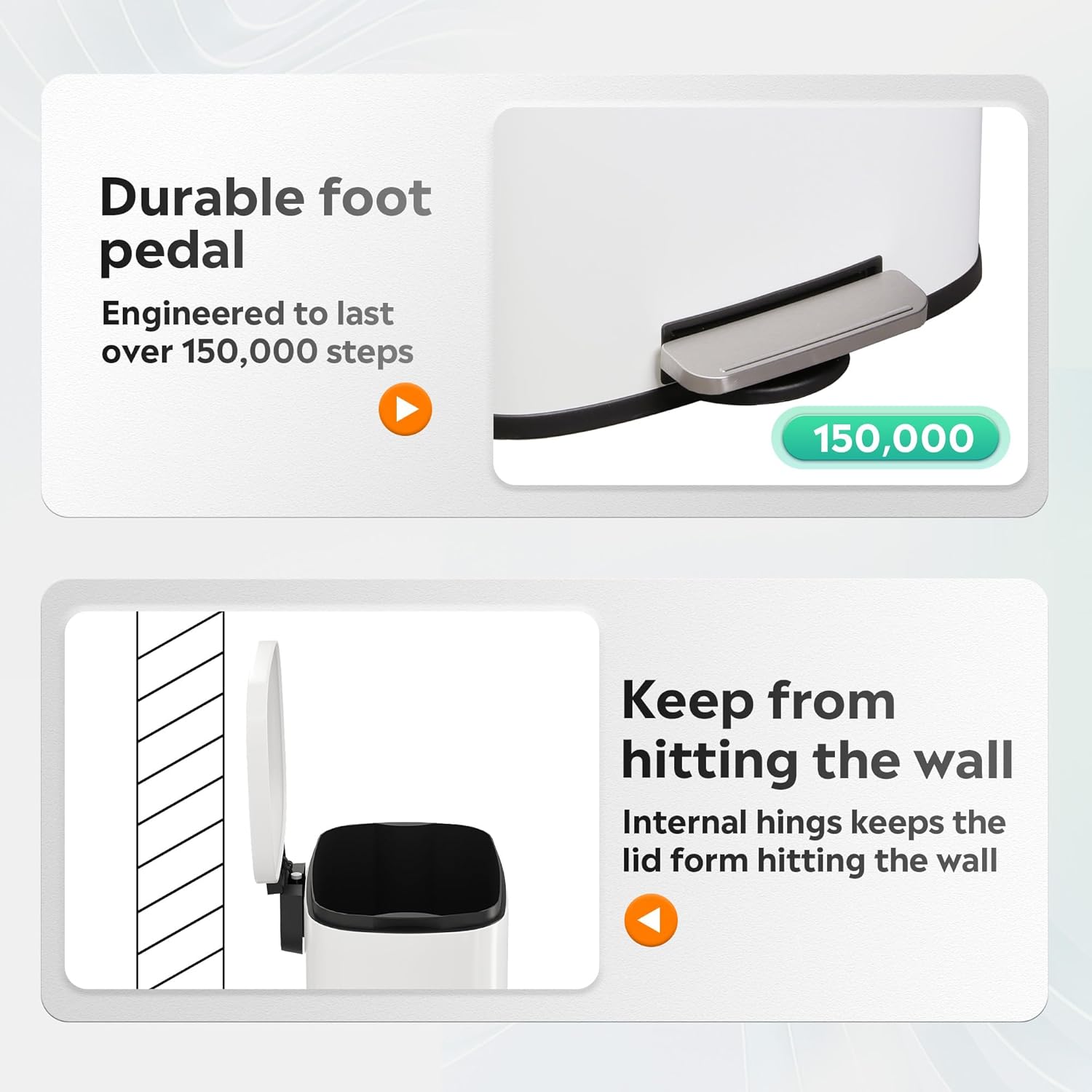 - Hands-free Operation: The ergonomically designed stainless steel foot pedal allows you to open the trash can easily without using your hands. When you need to change the garbage bag or perform a large-scale cleaning, simply push the lid to a 90° angle to keep it open.