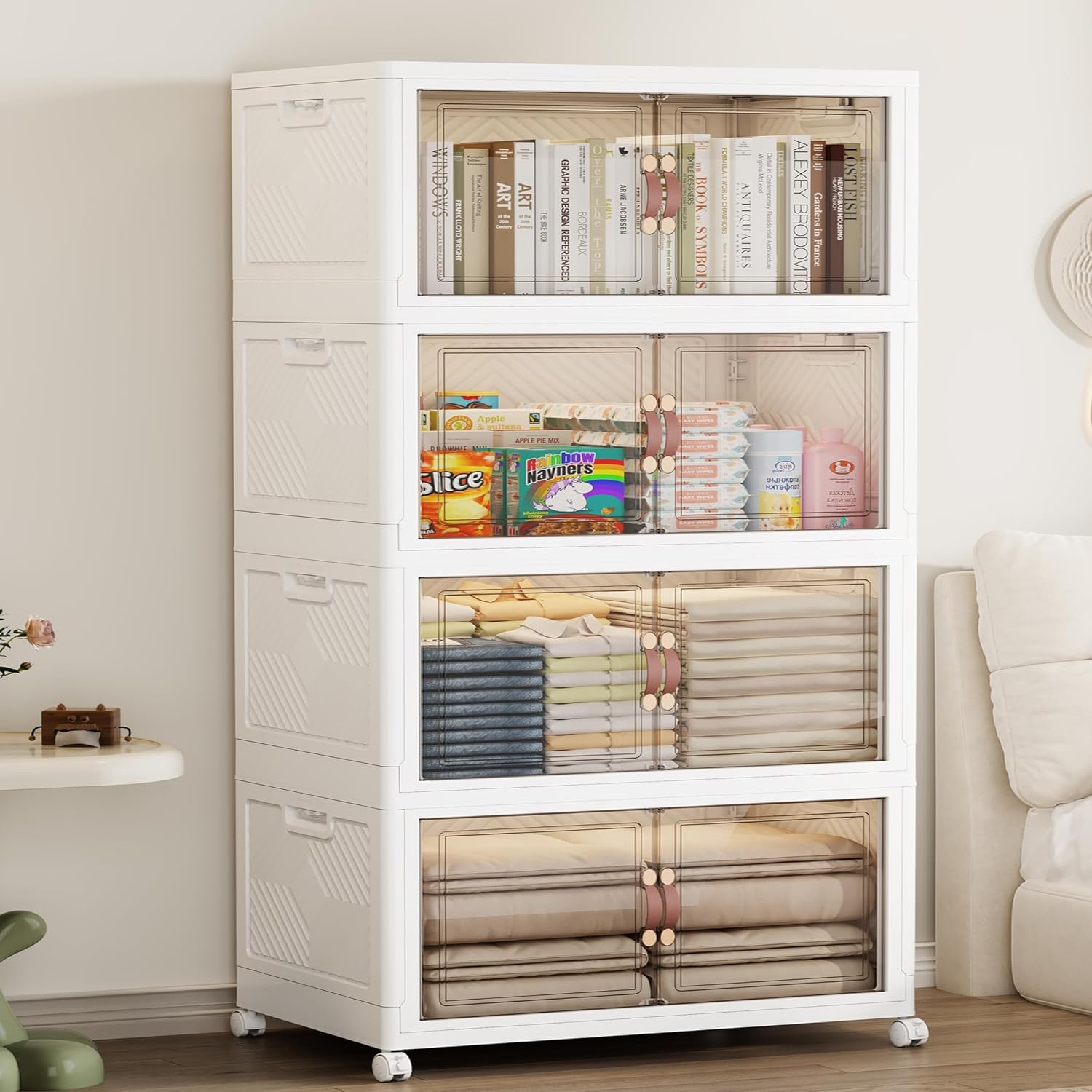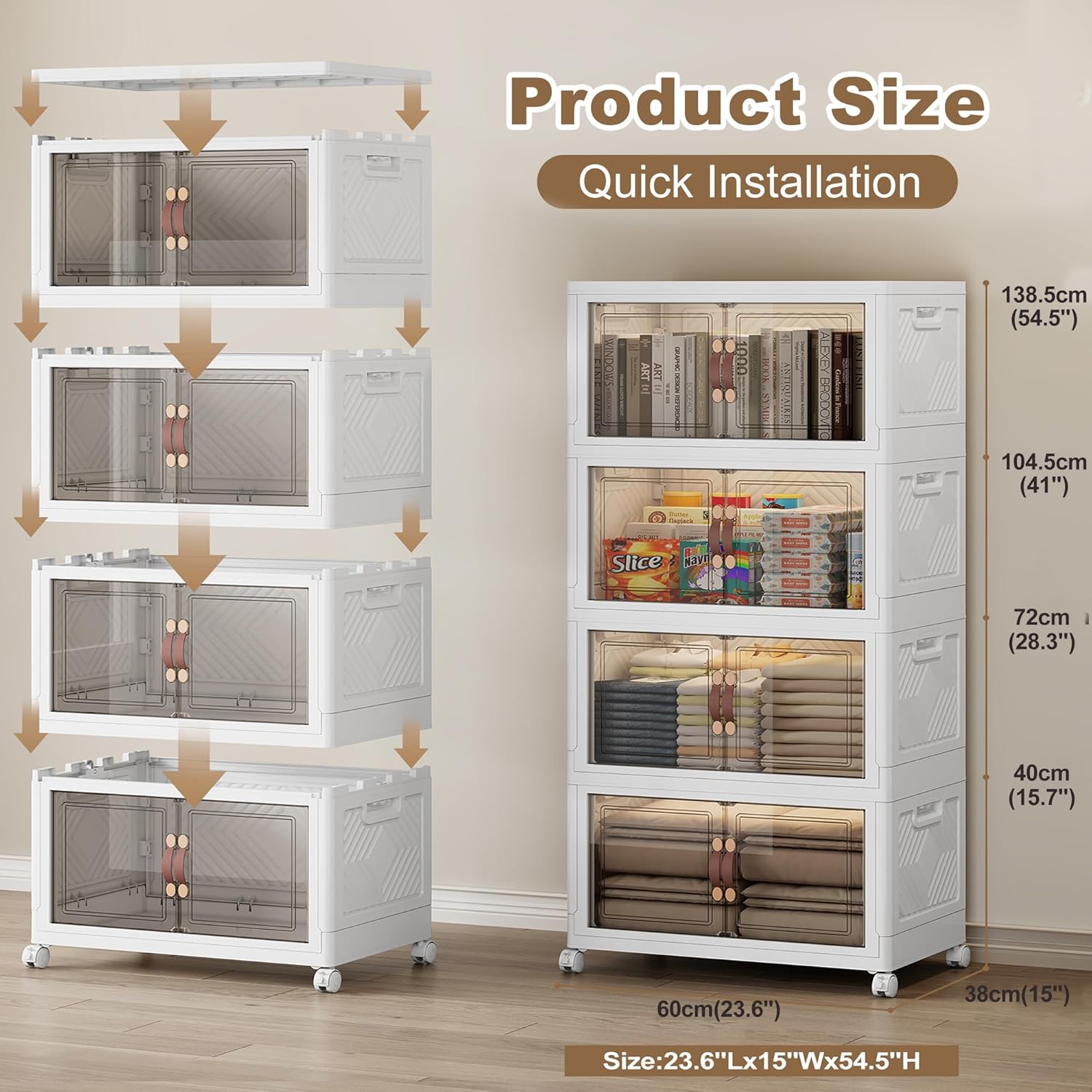 - 【Dual Access Design】You can choose between a front door with a magnetic latch handle (for regular small items) or an overhead door (for accessing bulky items such as blankets, luggage or holiday decorations). The magnetic door design ensures that nothing falls out and opens smoothly. Large stackable storage bins stores more items.
