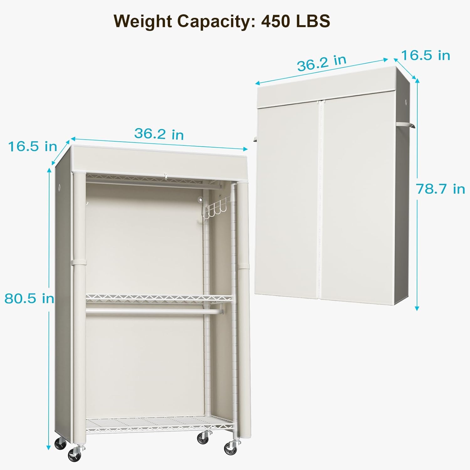 - Overall Dimension: The covered clothes rack whole size is 36.2"W x 16.5"D x 80.5"H, which combines with 3 wire shelves and 2 hanger rods for loading 450 lbs