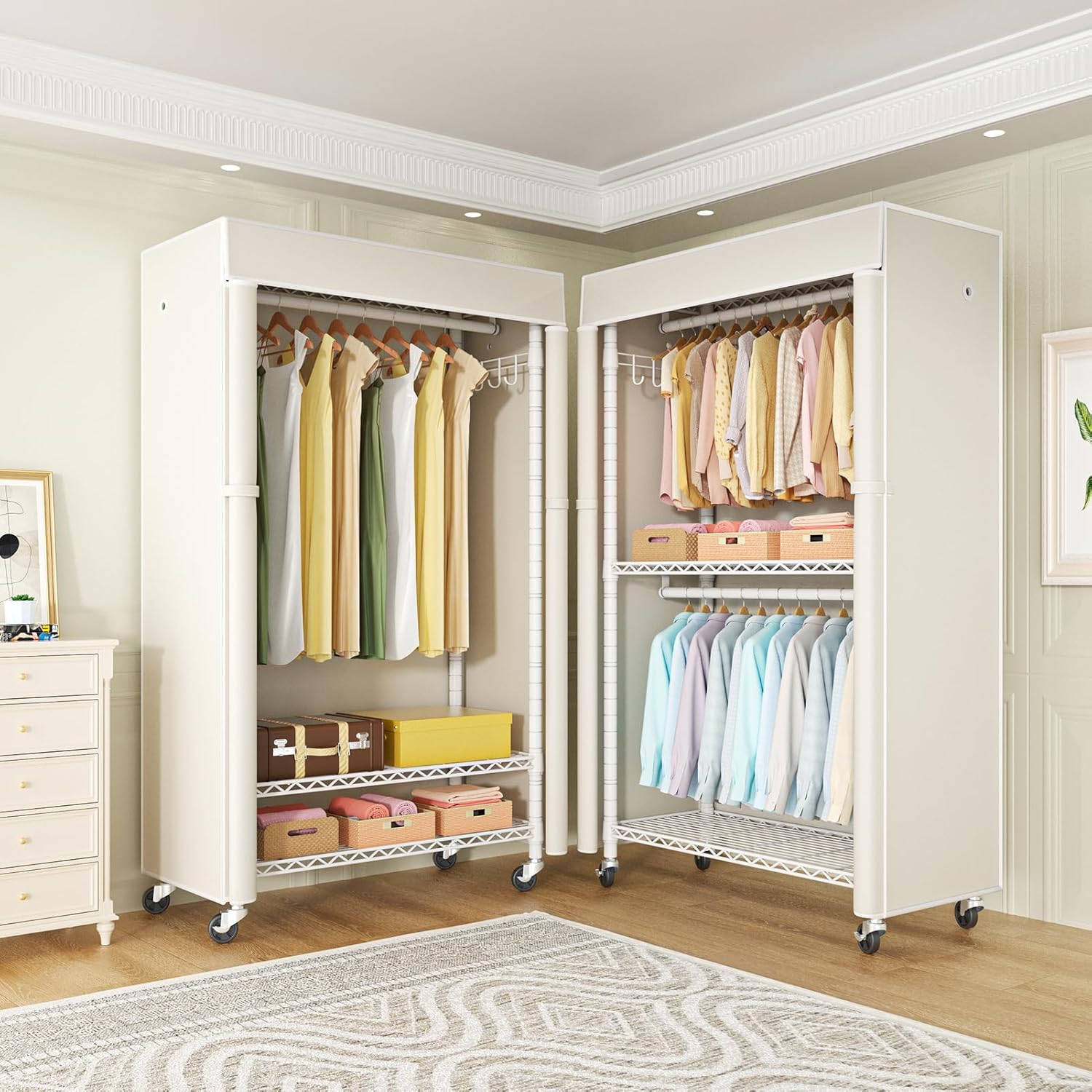 FUTASSI White Clothing Rack with Beige Cover, P1C Rolling Closets with Wheels, Metal Garment Rack for Hanging Clothes, Clothing Storage Wardrobe, 36.2" W x 16.5" D x 80.5" H, Load 450 Pounds